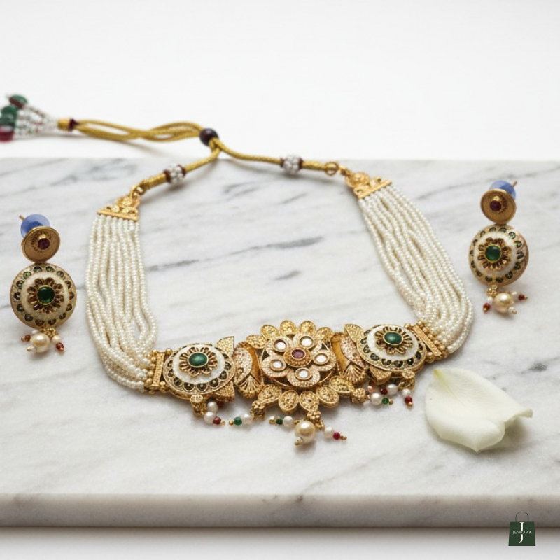 Grace your festive look with this beautifully handcrafted temple-inspired pearl choker set. Designed with multiple strands of fine white pearls, the necklace is highlighted by intricate antique gold floral motifs adorned with green and ruby-toned stones. The central floral panel adds a royal touch, while delicate pearl and bead drops enhance its traditional charm. Paired with matching round stud-drop earrings, this set is perfect for weddings, poojas, and cultural celebrations.