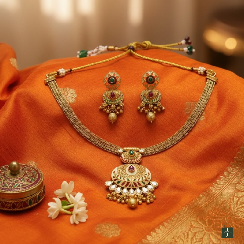 Elevate your festive look with this beautifully crafted temple-inspired necklace set designed in a rich antique gold finish. The necklace features multiple fine gold-toned strands that gracefully sit along the neckline, highlighted by a detailed meenakari pendant adorned with ruby, emerald, and white stone accents. The pendant is further embellished with delicate pearl-like drops, adding traditional charm. Paired with matching dome-style jhumka earrings, this set perfectly complements sarees and ethnic wear for weddings, festive celebrations, and cultural occasions.