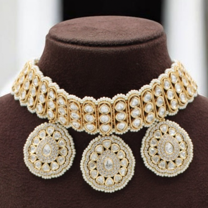 The set includes matching round statement earrings designed with intricate kundan detailing and pearl edging, perfectly complementing the choker. The balanced combination of white kundan stones, pearl accents, and antique gold polish creates a timeless bridal look.