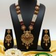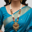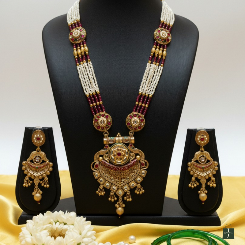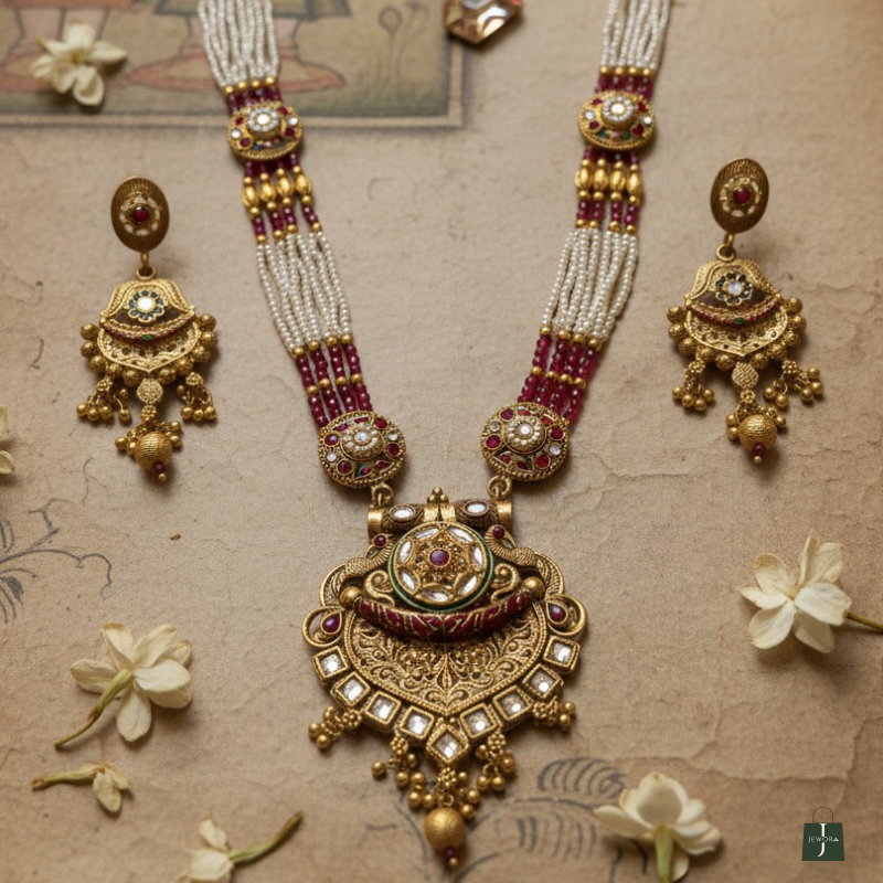 Celebrate timeless Indian craftsmanship with this majestic temple-inspired necklace set. Designed with multiple strands of fine white pearls intertwined with rich green beads, the necklace is highlighted by intricately carved antique gold motifs. The grand central pendant features detailed filigree work, kundan-style stone setting, and delicate drop accents that enhance its regal charm. Paired with traditional jhumka-style earrings, this set is perfect for weddings, festive occasions, and cultural celebrations.