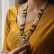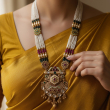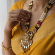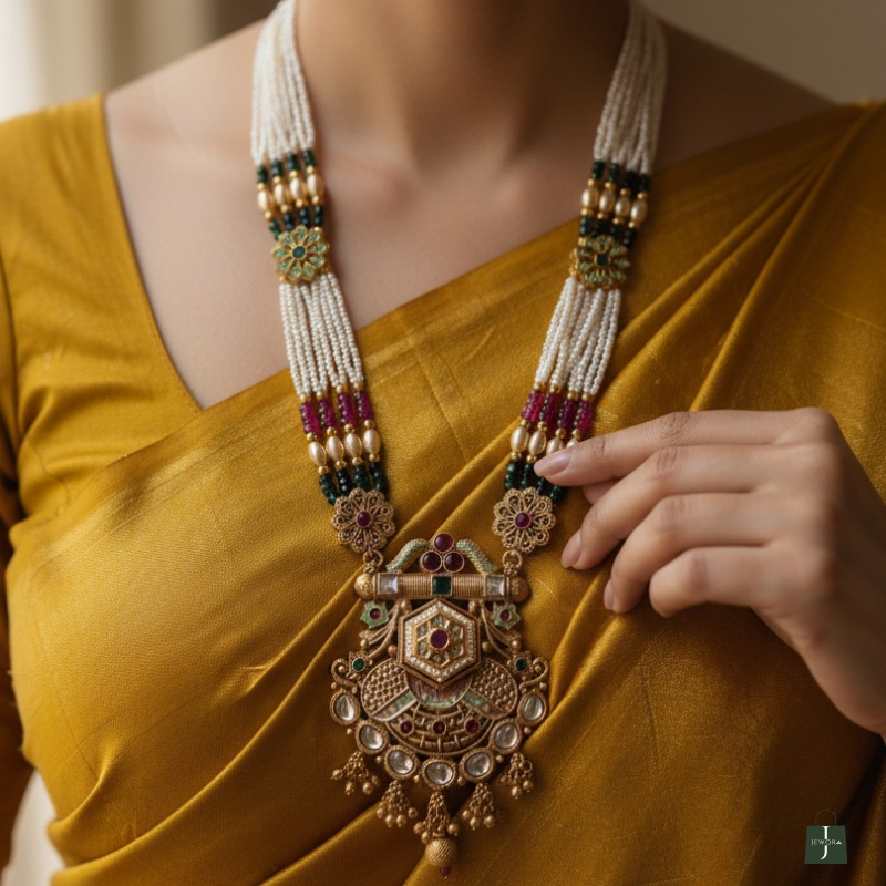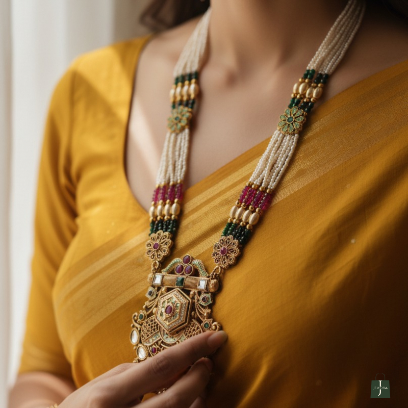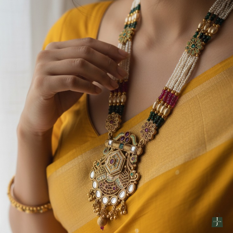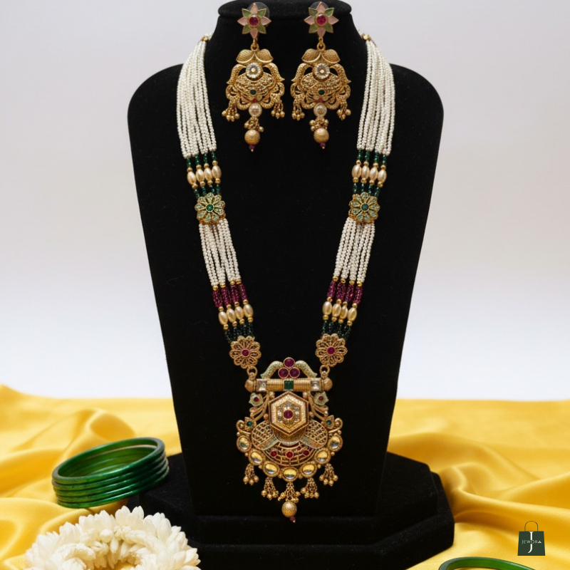 Embrace timeless tradition with this exquisite temple-inspired long haar set. Designed with multiple strands of fine white pearls, accented with green and ruby-toned beads, this necklace reflects classic South Indian heritage craftsmanship. The ornate antique gold pendant features intricate carvings, kundan-style stone settings, and delicate hanging bead charms that enhance its regal appeal. Paired with matching traditional drop earrings, this set is ideal for bridal wear, festive occasions, and cultural celebrations.