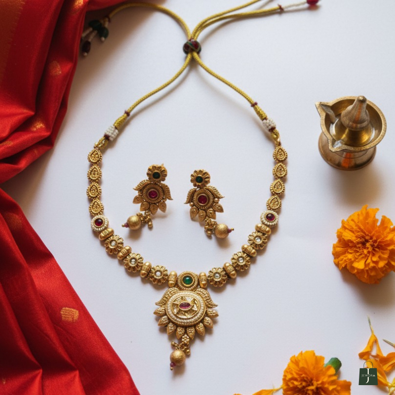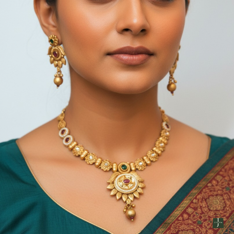 Embody divine elegance with this beautifully crafted temple-inspired necklace set. Designed in a rich antique gold finish, the necklace features intricate floral and coin-style motifs adorned with ruby and emerald-toned stone accents. The striking sun-inspired central pendant, detailed with kundan-style stones and delicate gold bead drops, adds a regal and traditional charm. Paired with matching floral drop earrings, this set is perfect for weddings, festive celebrations, and cultural occasions.