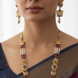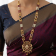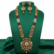 Celebrate timeless heritage with this Rajvanshi Ruby Pearl Temple Long Necklace Set, designed to reflect royal South Indian craftsmanship. This elegant long haram features multi-strand pearl and maroon bead detailing, beautifully complemented by antique gold temple motifs.