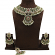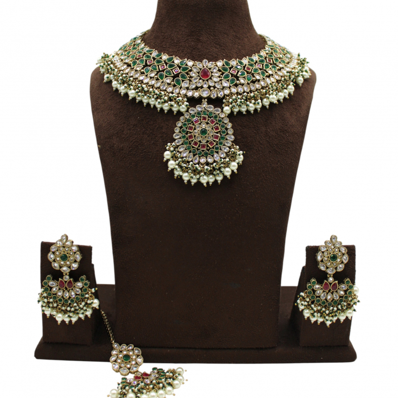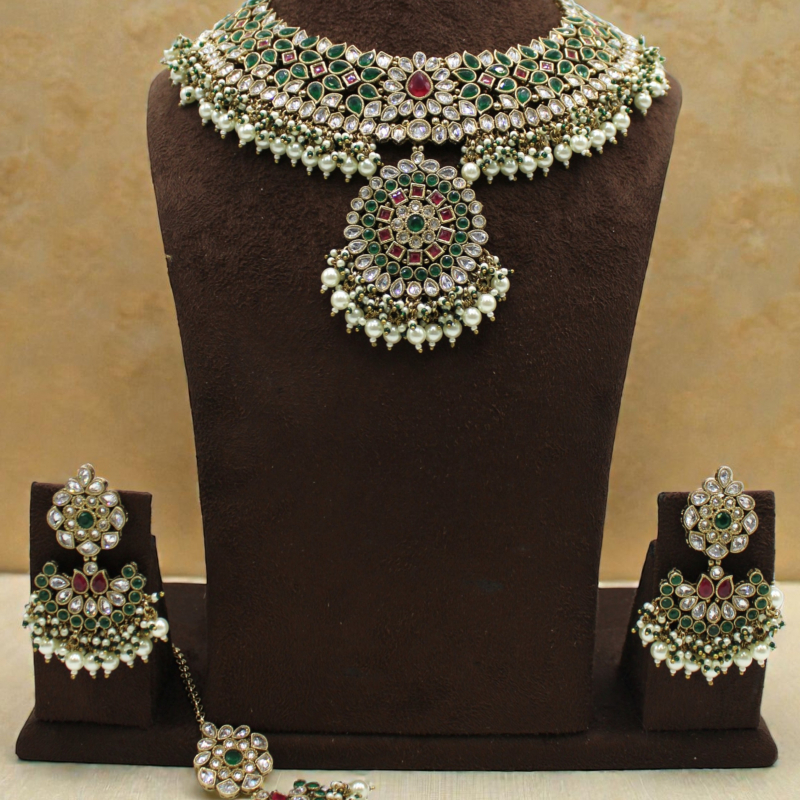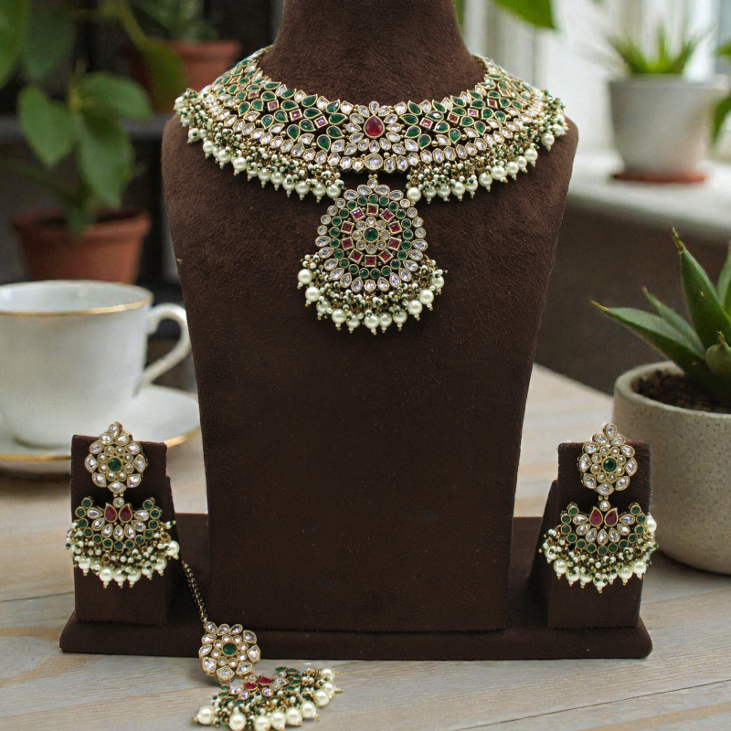 Make a majestic bridal statement with this exquisite Rajwada-inspired choker set. Designed with intricate layers of green and red stones highlighted by shimmering white Kundan work, this piece reflects timeless royal craftsmanship. The broad choker features detailed stone setting with elegant pearl fringes along the edge. A grand circular pendant adds depth and richness to the design, perfectly complemented by matching chandelier-style earrings and a coordinating maang tikka. Ideal for brides and grand festive occasions.