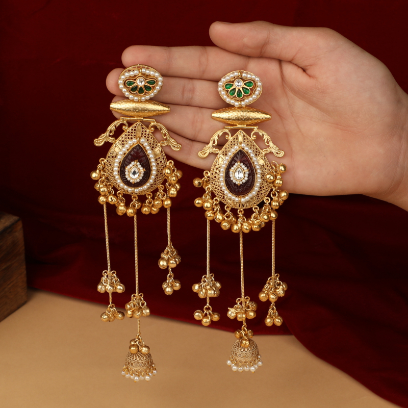 Add a touch of refined tradition to your jewellery collection with these exquisitely handcrafted long earrings. Designed with a graceful oval stud highlighted by subtle green enamel detailing, the earrings flow into an ornate gold-toned framework that showcases a deep, rich centre stone framed with delicate pearl accents.