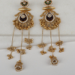 Clusters of tiny gold beads form a textured halo around the central motif, while slender chain tassels cascade below, ending in a petite pearl-detailed jhumka. The layered elements create elegant movement and depth, making these earrings visually captivating from every angle.