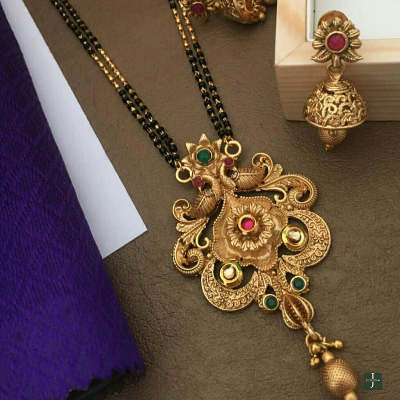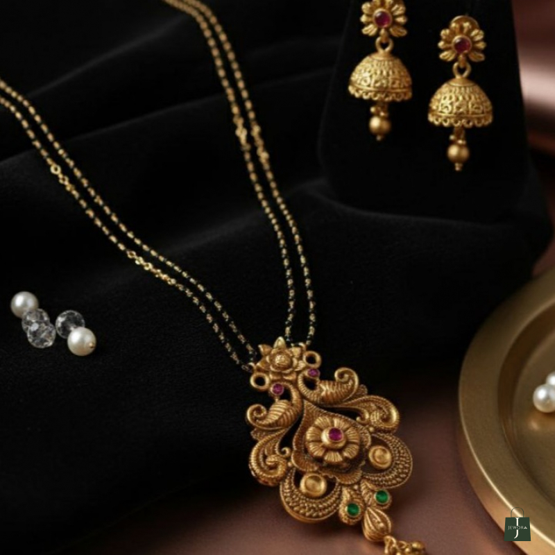 The Rajwada Peacock Bloom Mangalsutra Set is a majestic temple-inspired jewellery piece that blends royal peacock motifs with blooming floral artistry. The pendant showcases a layered peacock-floral design with intricate embossed carvings, circular medallion elements, and a graceful hanging charm. Ruby-red and emerald-green stones add rich color contrast, while the traditional double black-beaded chain enhances its classic mangalsutra appeal.