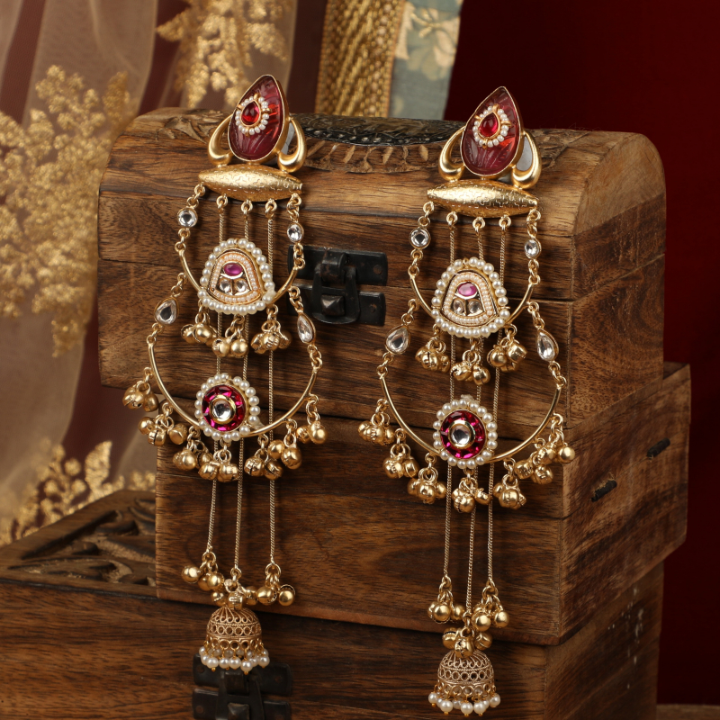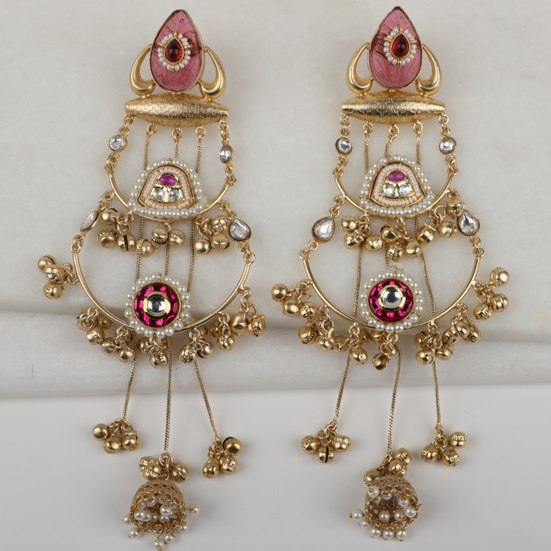 Suspended below is a beautifully layered structure accented with mirror-style elements, delicate pearl highlights, and fine gold-tone frameworks. Tiny gold bead clusters add texture and movement, while the design flows into a petite jhumka at the base, finished with pearl detailing for a soft, classic touch.