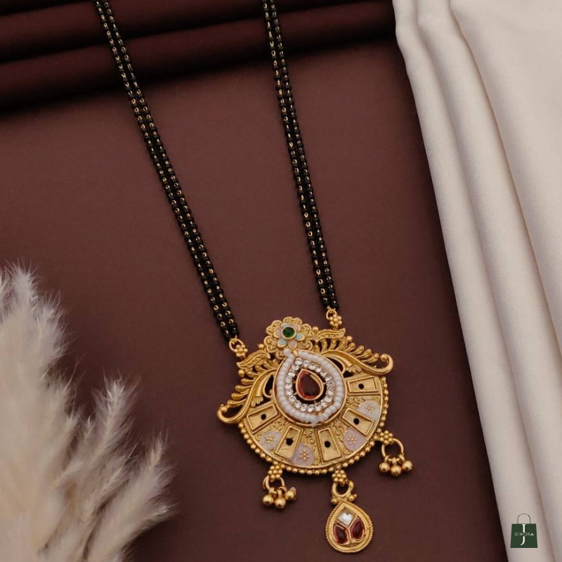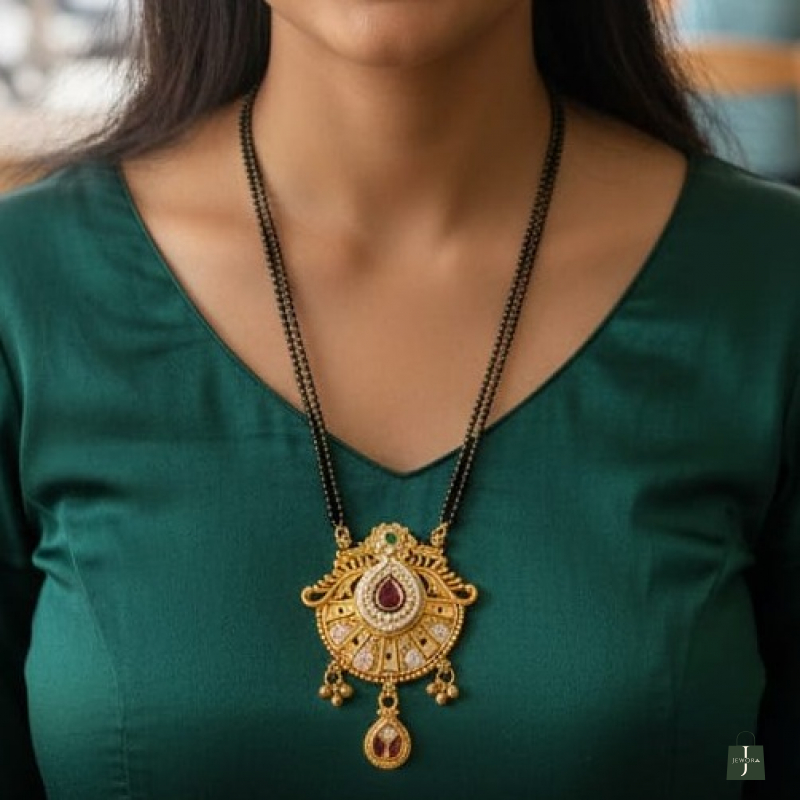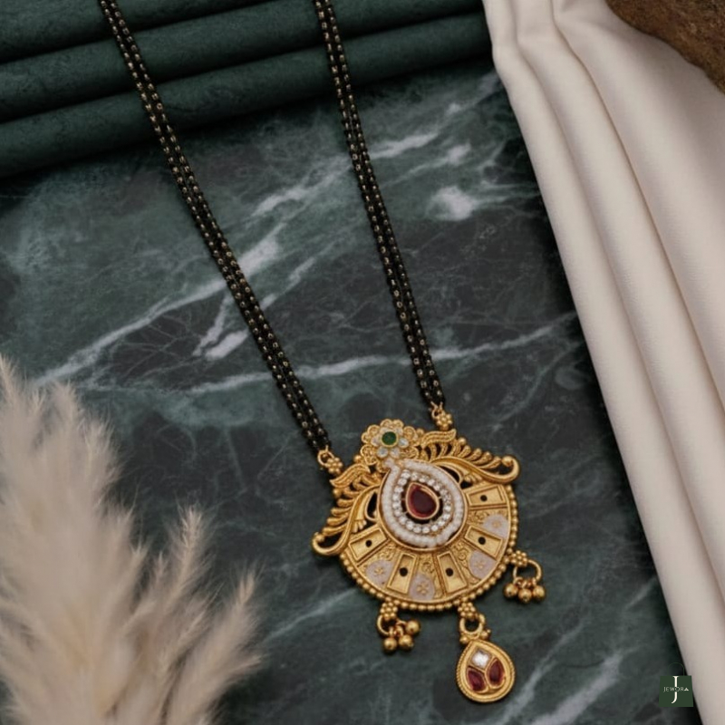 Celebrate timeless elegance with this beautifully crafted Rajwada-inspired mangalsutra pendant necklace. Designed with intricate antique detailing, the pendant features a striking teardrop ruby-tone stone at the center, encircled with delicate white pearl accents. The ornate gold-finish frame adds a royal charm, while the classic black-beaded mangalsutra chain enhances its traditional appeal. Perfect for festive occasions, weddings, and daily traditional wear.