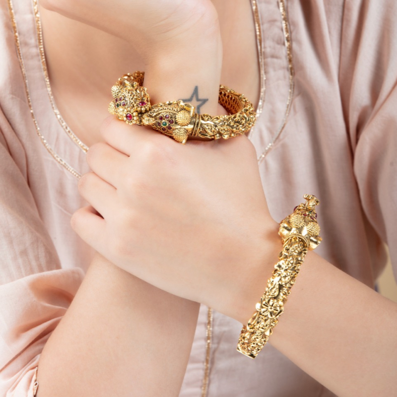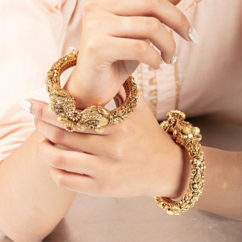Elevate your traditional look with this exquisite pair of antique gold kada bangles, intricately designed with royal elephant motifs. Crafted with detailed temple-style carvings and adorned with subtle multicolor stone accents, these bangles reflect timeless heritage and regal charm. The bold and structured design makes them perfect statement pieces for weddings, festive occasions, and ethnic celebrations. Pair them with sarees, lehengas, or traditional outfits for a grand and elegant appearance.