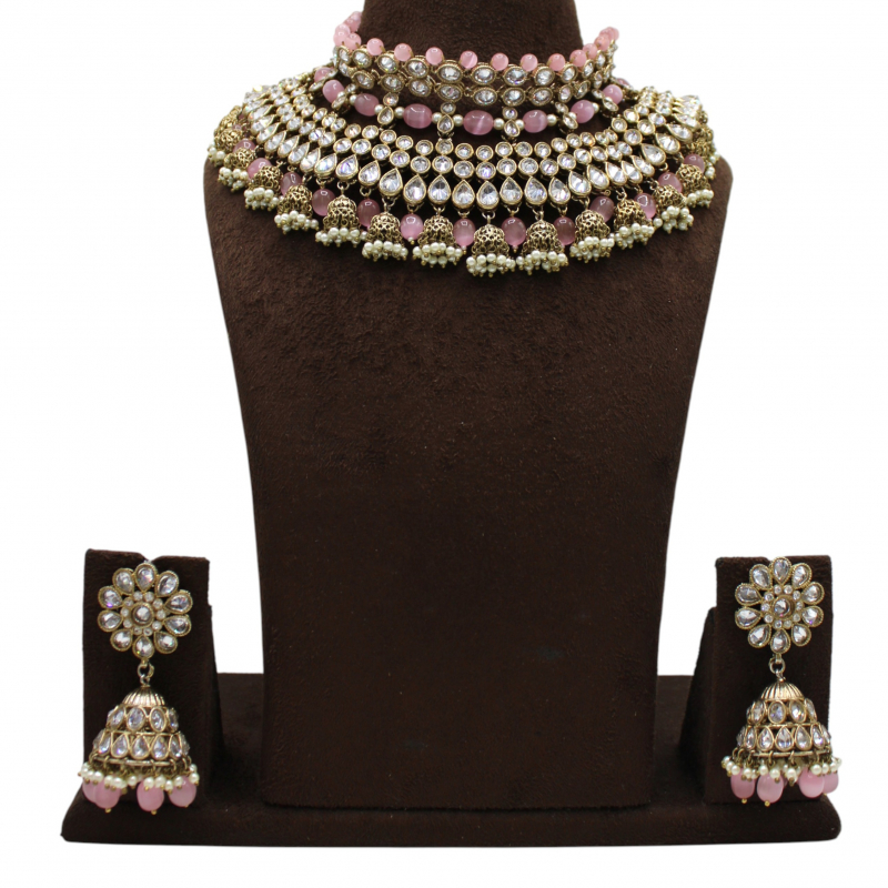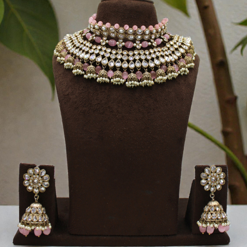 Add a touch of royal elegance to your look with this beautifully crafted Rajwadi Blush Pink Kundan Pearl Choker Set. Designed with layered kundan stone detailing, this stunning choker is highlighted with soft blush pink beads that enhance its feminine charm.
