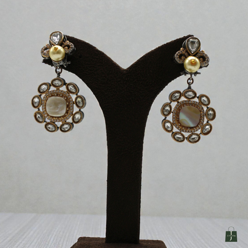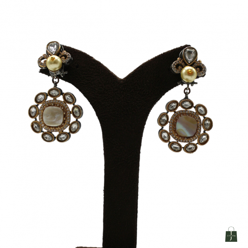 Add timeless elegance to your jewellery collection with these stunning Rajwadi Chandrima Kundan Drop Earrings. Designed in a graceful floral pattern, these earrings feature a soft mother-of-pearl center stone, surrounded by sparkling white polki stones in a circular halo design.
