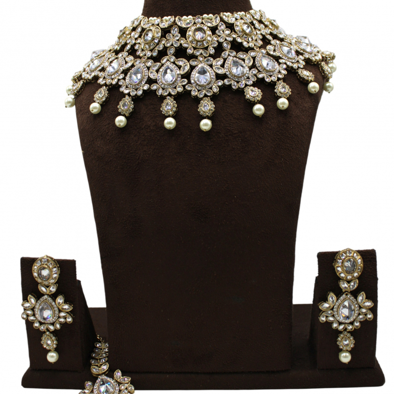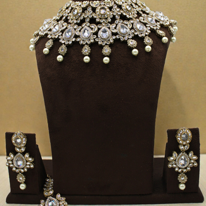 Radiate timeless bridal elegance with this stunning Rajwadi Classic Polki Pearl Choker Set. Designed with intricate floral craftsmanship, this luxurious choker features shimmering polki-style stones set in antique gold polish.