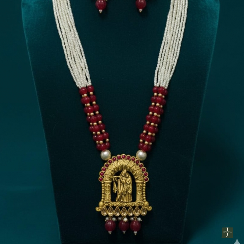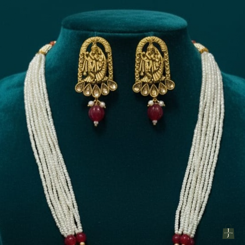 Grace your look with royal elegance through this stunning Rajwadi Divine Pearl Temple Necklace Set. Inspired by traditional South Indian temple jewellery, this masterpiece features multiple layers of fine white pearl strands beautifully paired with antique gold-finish beads.