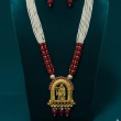 The highlight of this set is the intricately crafted temple-style pendant showcasing a divine deity motif, surrounded by detailed carvings and finished with elegant pearl danglers. The matching earrings mirror the same royal temple design, creating a perfectly coordinated look.