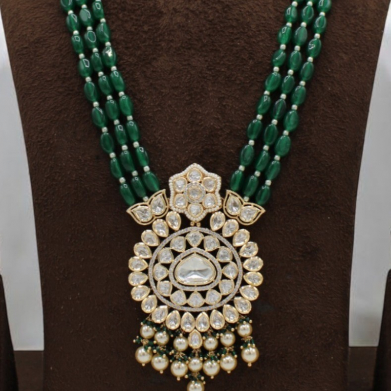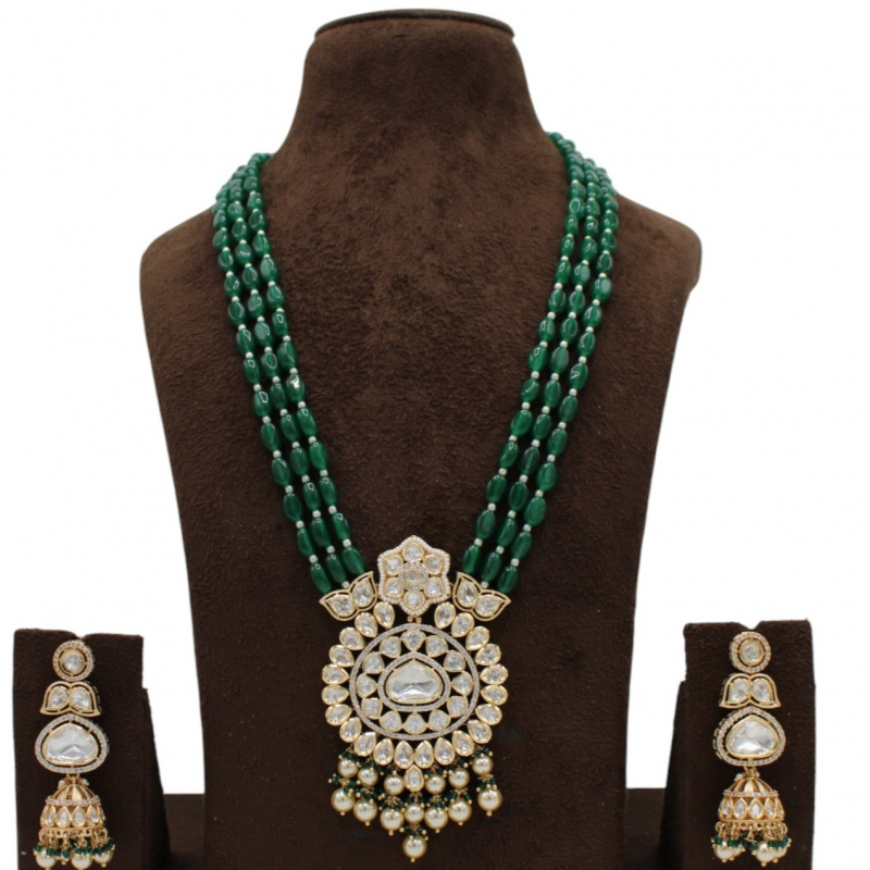 Elevate your bridal and festive look with this exquisite Rajwadi Emerald Kundan Ranihaar Set, crafted in timeless royal heritage style. This luxurious long necklace features multiple strands of rich green beads paired with a grand circular Kundan pendant. The intricately designed pendant is embellished with high-quality uncut-style stones and finished with elegant pearl drops, giving it a majestic and traditional appeal.