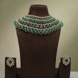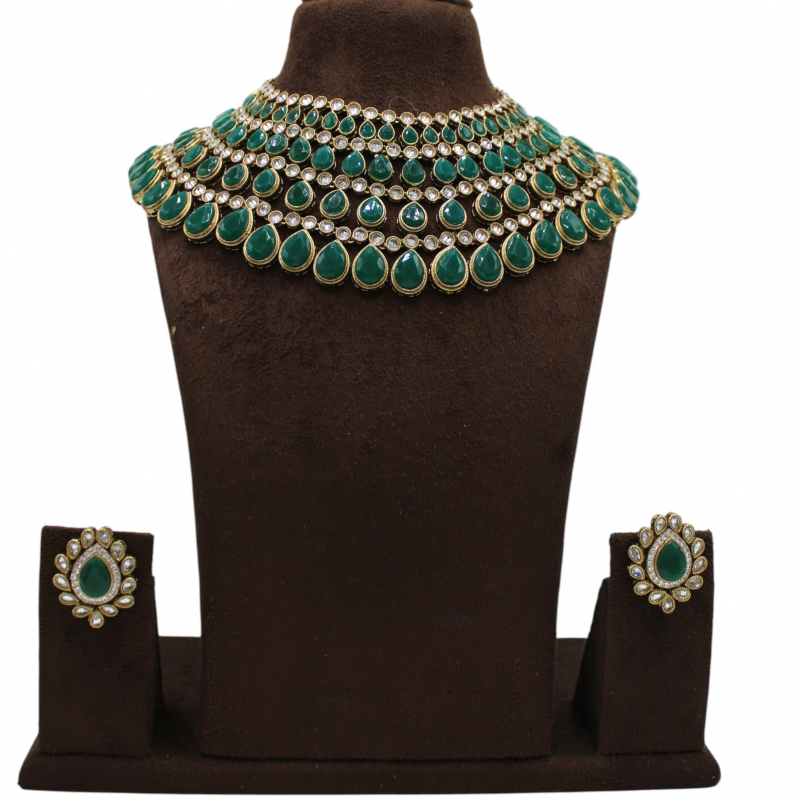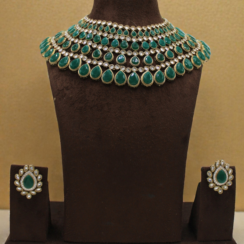 The rich green tones combined with classic kundan craftsmanship create a timeless royal look, perfect for brides and grand festive occasions. The layered structure gives the necklace a heavy and majestic appearance, making it ideal for statement bridal styling.