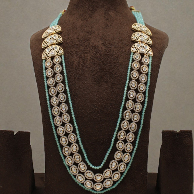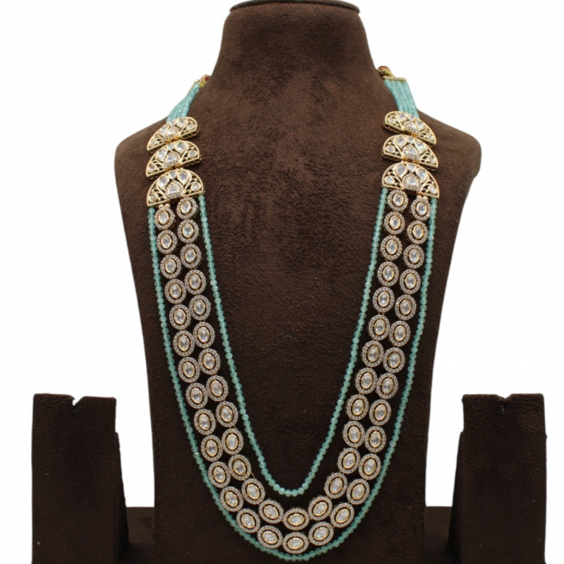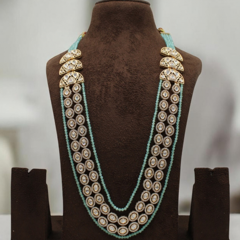 Introducing the elegant Rajwadi Firoza Noor Long Haar Set, a graceful blend of traditional kundan artistry and refreshing firozi bead elegance. Inspired by royal Rajasthani heritage jewellery, this long multi-layer necklace is designed to create a bold yet sophisticated bridal statement.