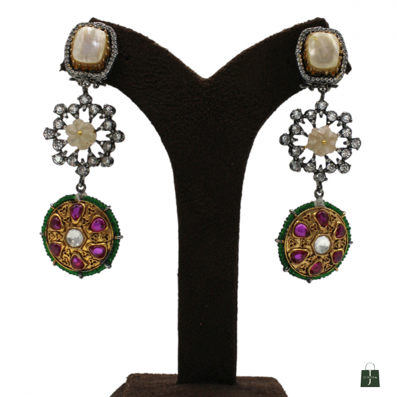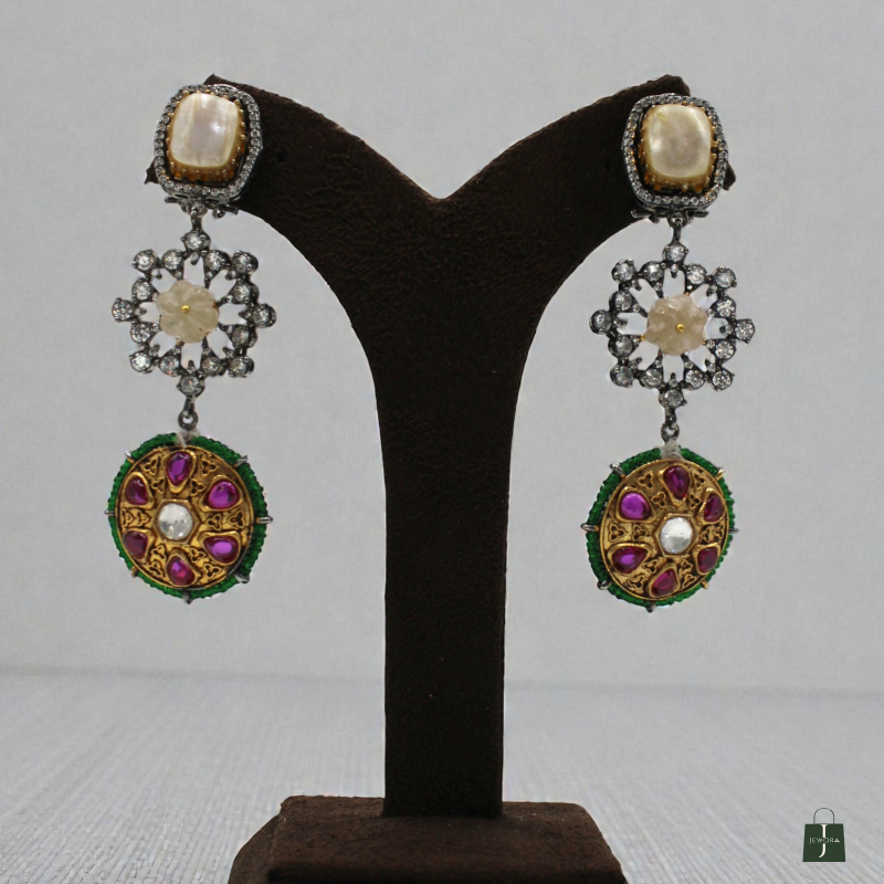 Add a touch of royal charm to your jewellery collection with these Rajwadi Floral Kundan Drop Earrings. Designed in a layered floral pattern, these earrings feature a beautiful combination of pearl-tone stones, sparkling white crystals, and vibrant magenta kundan accents set inside a rich green enamel frame.