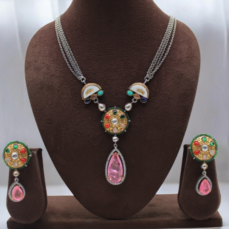 Add a touch of royal fusion elegance to your collection with this stunning Rajwadi Fusion Navratna Pink Drop Pendant Necklace Set. Designed with a modern multi-chain silver-tone base, this necklace beautifully blends traditional navratna artistry with contemporary styling.