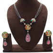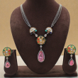Paired with matching statement earrings featuring the same navratna motif and pink drop design, this set is perfect for festive wear, parties, and elegant traditional occasions.