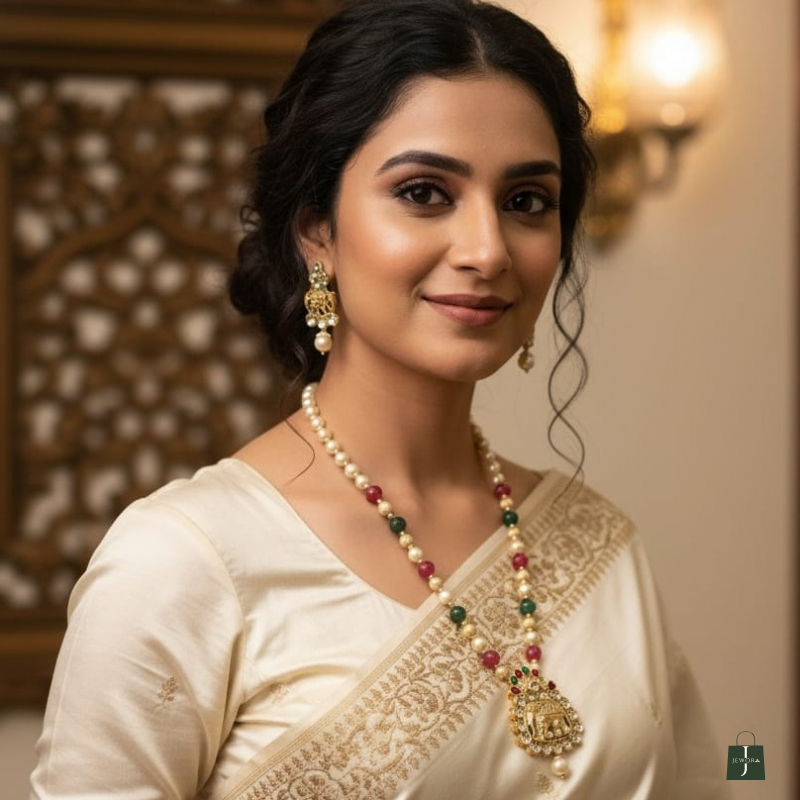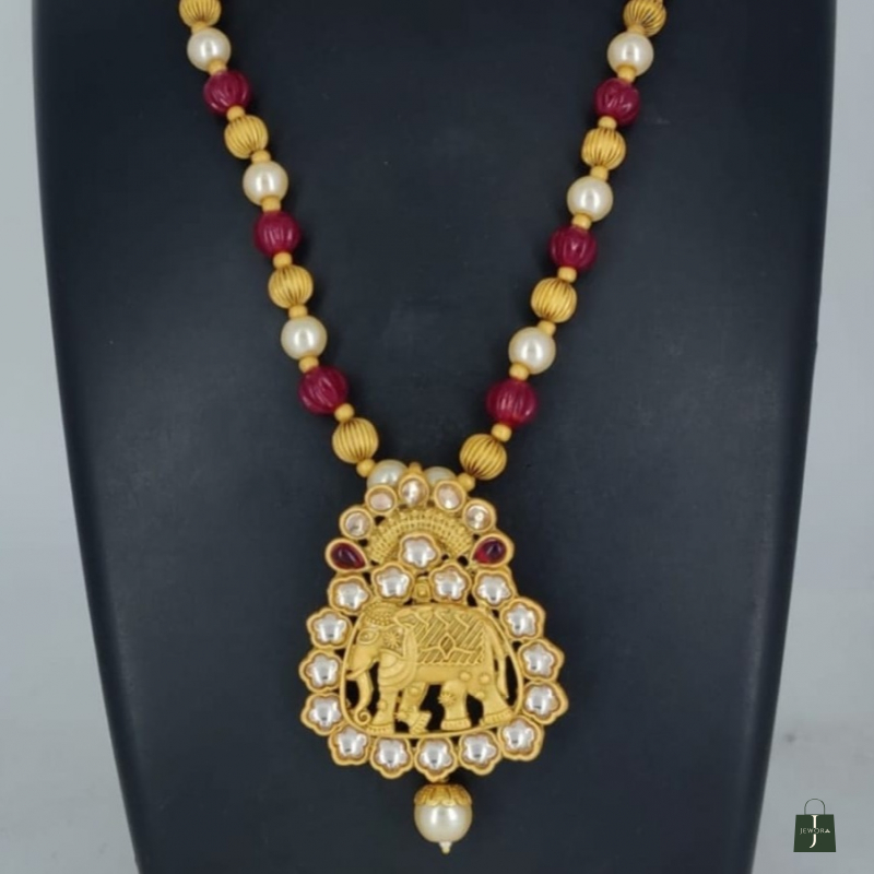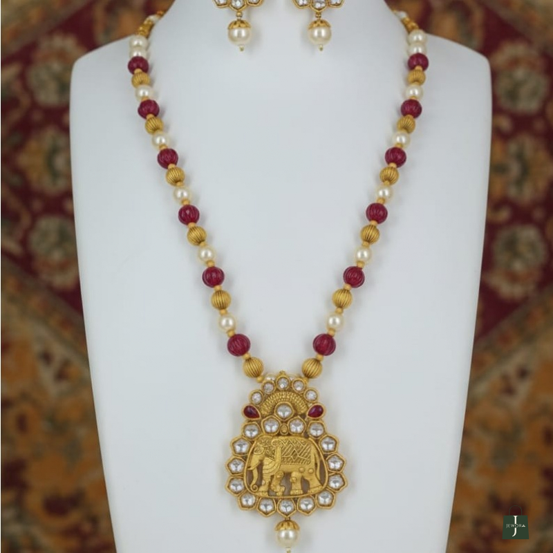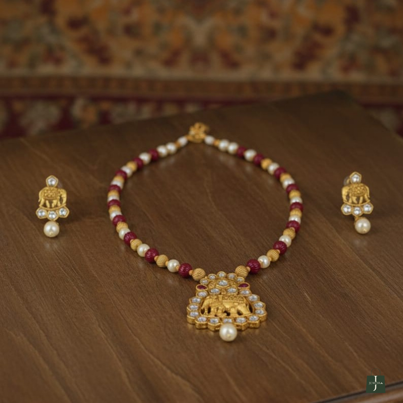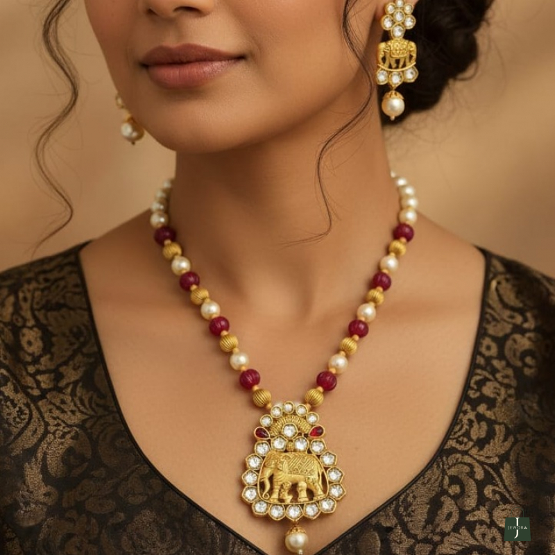 Matching elephant motif earrings with pearl drops perfectly complement the necklace, making this set ideal for weddings, festive occasions, and traditional celebrations.