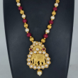The necklace is crafted with alternating cream pearl beads, deep ruby red beads, and antique gold ribbed beads, creating a rich and regal look. The pendant is embellished with white kundan-style stones and ruby accents, finished with a graceful pearl drop for added elegance.