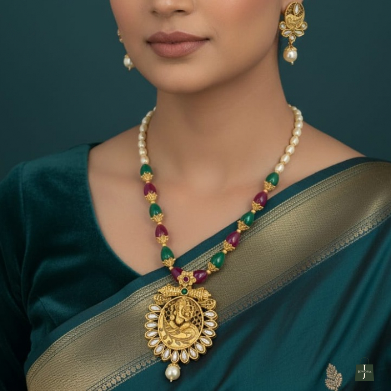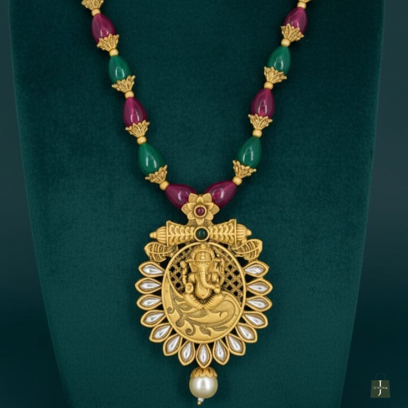 Celebrate royal tradition with this stunning Rajwadi Ganesh Heritage Long Haar Set, inspired by classic temple jewellery designs. This elegant long necklace features a beautifully crafted Lord Ganesha pendant, symbolizing prosperity and divine blessings.
