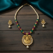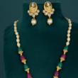 The necklace is adorned with white pearl beads at the top, followed by alternating emerald green and ruby pink beads, giving it a rich royal appeal. The grand circular pendant showcases intricate detailing with kundan-style white stones and a pearl drop at the bottom, enhancing its traditional charm.