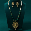 The necklace is adorned with white pearl beads at the top, followed by alternating emerald green and ruby pink beads, giving it a rich royal appeal. The grand circular pendant showcases intricate detailing with kundan-style white stones and a pearl drop at the bottom, enhancing its traditional charm.