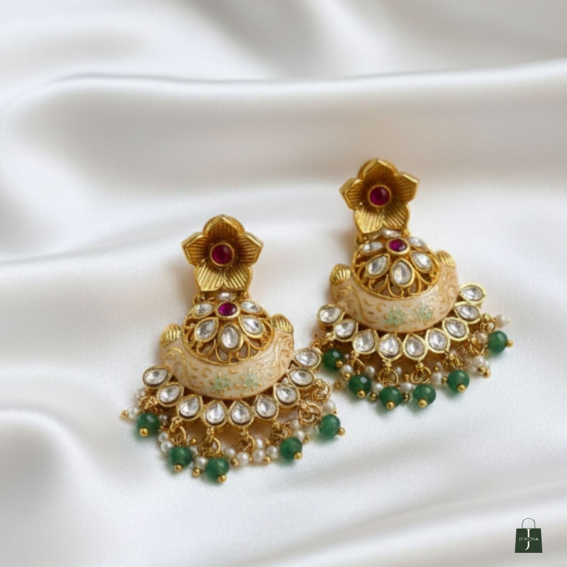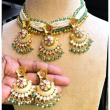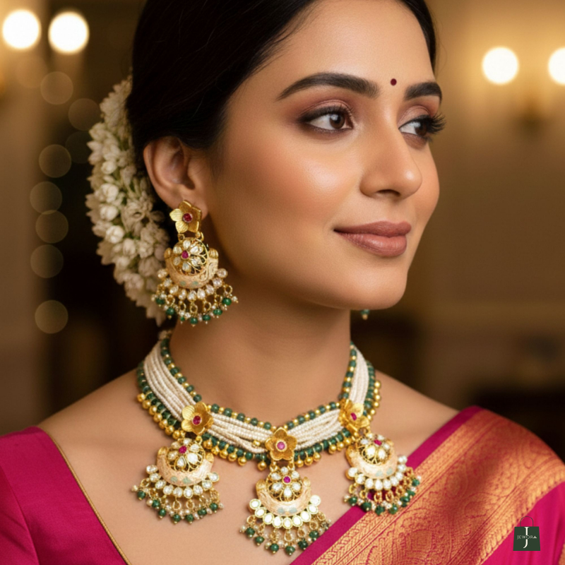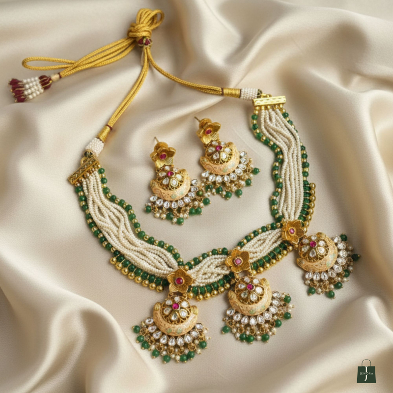 Add a touch of royal elegance to your ethnic wardrobe with this Rajwadi Green Polki Pearl Necklace Set. Designed in a classic Rajwadi jewellery style, this statement piece features layered pearl strands beautifully complemented by green beads and intricate polki-style jhumki motifs. The antique gold-tone finish enhances its heritage appeal, making it a perfect choice for traditional occasions
