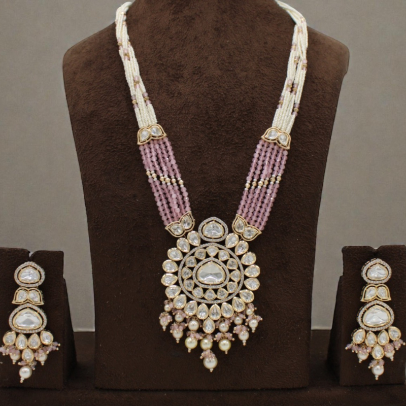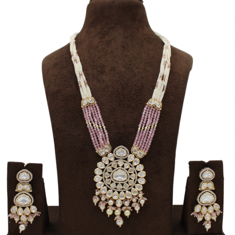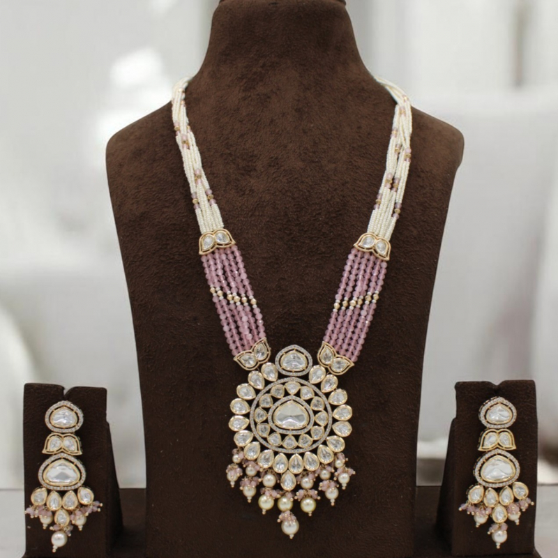 The highlight of the set is its grand circular kundan pendant, beautifully layered with pear-shaped and round polki stones. The pendant is finished with pearl and pink bead danglings, enhancing its royal charm. The upper portion of the necklace is adorned with elegant kundan motif connectors, adding a refined heritage touch.