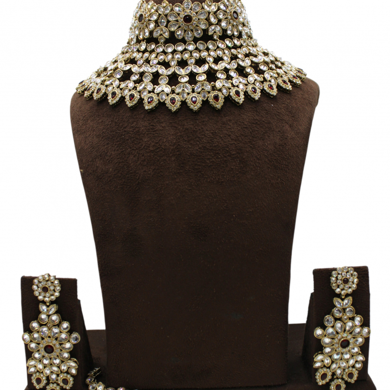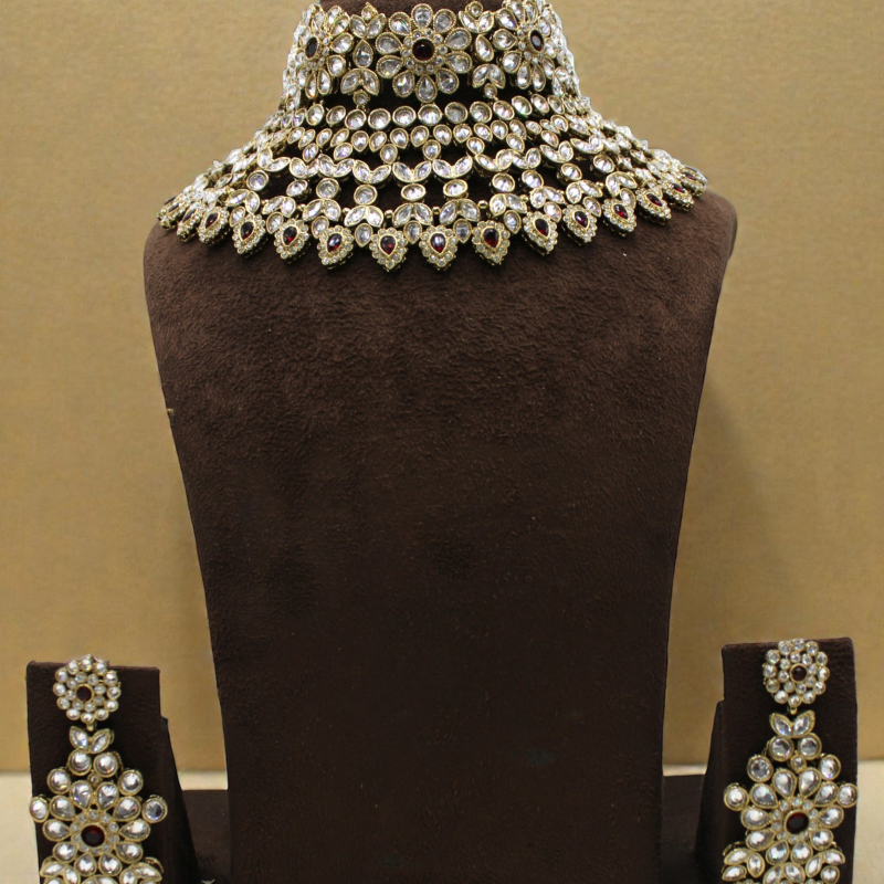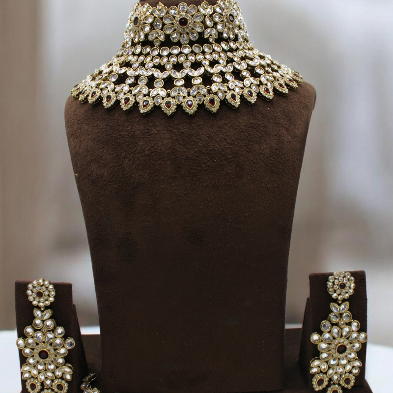 Experience timeless royal elegance with this stunning Rajwadi Gulbahar Kundan Choker Set. Designed with intricate floral motifs and layered detailing, this choker is adorned with sparkling white kundan stones beautifully highlighted with subtle ruby red center stones.