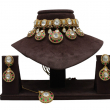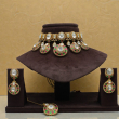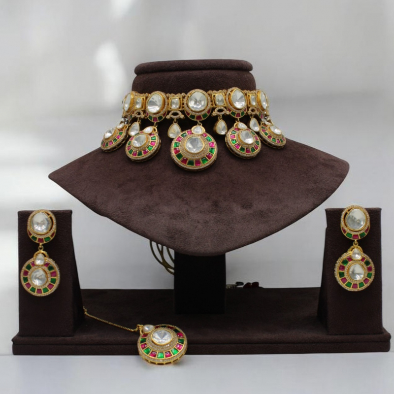 The dangling circular motifs add graceful movement and enhance the regal appeal of the piece. Paired with matching drop earrings and a coordinating pendant, this set is perfect for bridal wear, festive occasions, and grand celebrations.