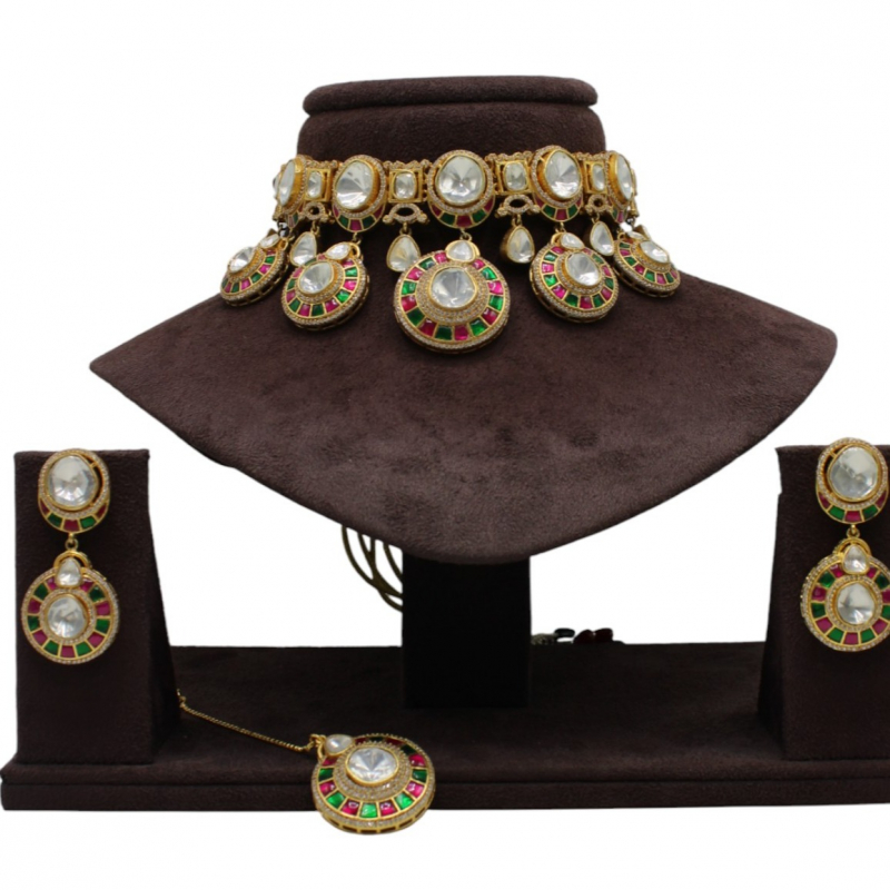 The combination of clear kundan stones with multicolour enamel work creates a rich heritage look that instantly elevates any ethnic outfit.