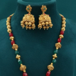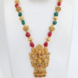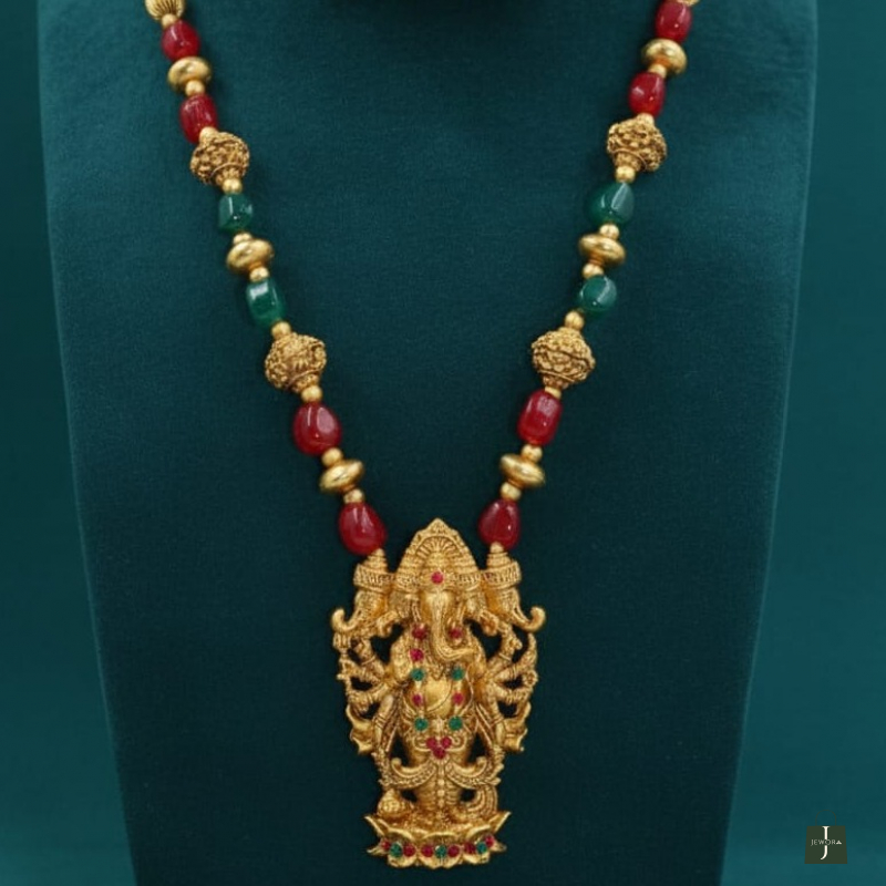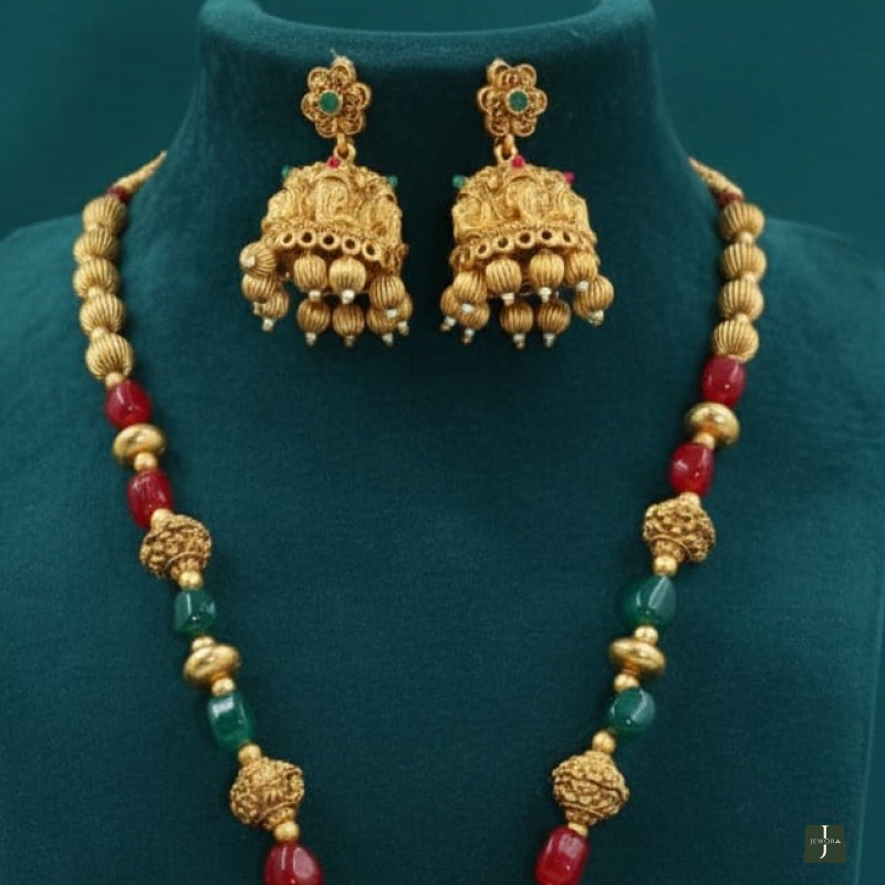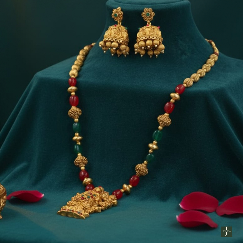 Experience timeless heritage with this magnificent Rajwadi Lakshmi Temple Long Haar Set. Crafted in antique gold finish, this divine jewellery set features an intricately carved Goddess Lakshmi pendant symbolizing prosperity and grace. The long haar is beautifully adorned with alternating red and green beads, along with textured gold beads that enhance its traditional South Indian temple appeal.