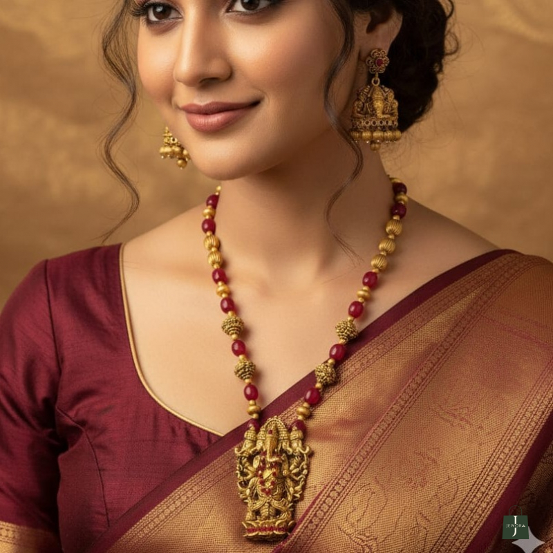 Experience timeless heritage with this magnificent Rajwadi Lakshmi Temple Long Haar Set. Crafted in antique gold finish, this divine jewellery set features an intricately carved Goddess Lakshmi pendant symbolizing prosperity and grace. The long haar is beautifully adorned with alternating red and green beads, along with textured gold beads that enhance its traditional South Indian temple appeal.