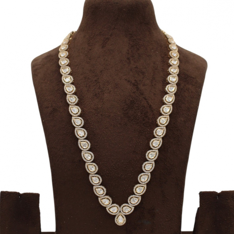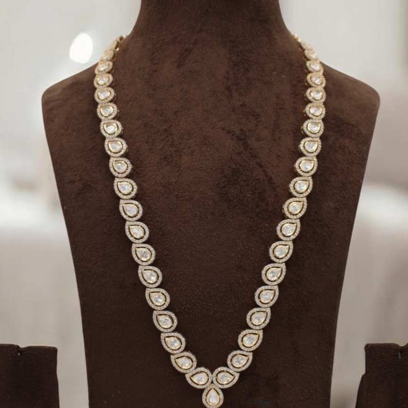 Introducing the Rajwadi Mayurika Polki Long Haar, a graceful masterpiece designed for women who adore timeless royal elegance. This stunning necklace features a continuous series of pear-shaped (teardrop) polki stones, each delicately framed with fine micro detailing that enhances its brilliance.