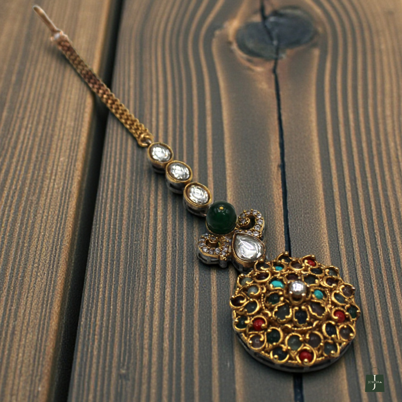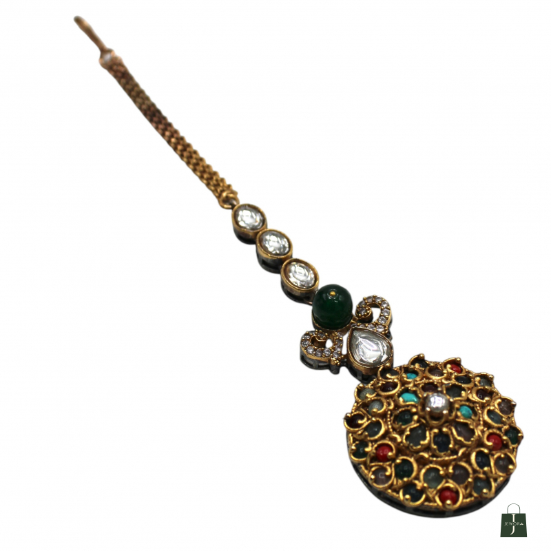 Enhance your traditional look with this elegant Rajwadi Meenakari Navratna Maang Tikka, designed with intricate floral craftsmanship and a royal antique finish. The round pendant features detailed gold carving filled with multi-colored Navratna stones, creating a vibrant and auspicious appeal.