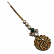 The upper section is beautifully decorated with white polki stones, a rich emerald green bead, and delicate kundan detailing, attached to a sleek gold-tone chain for a graceful forehead finish. Perfect for brides, festive wear, and traditional celebrations