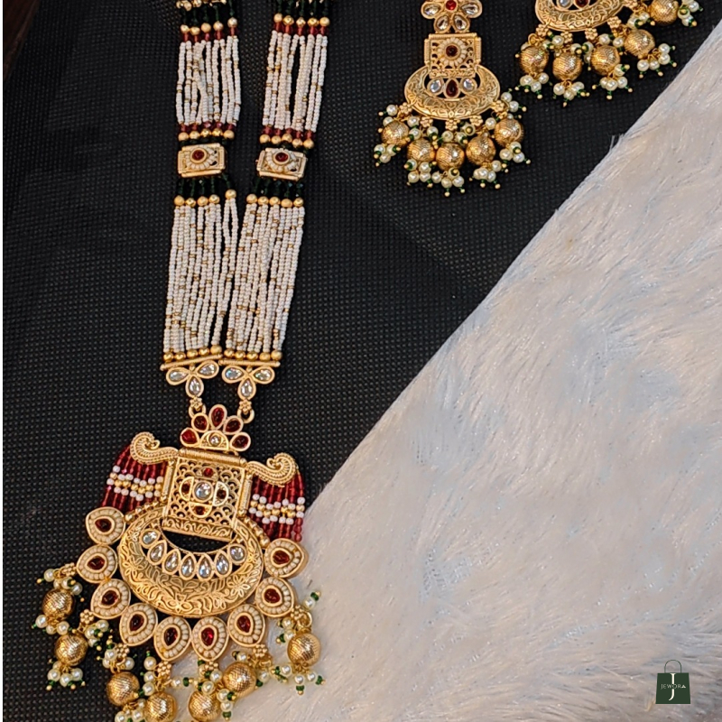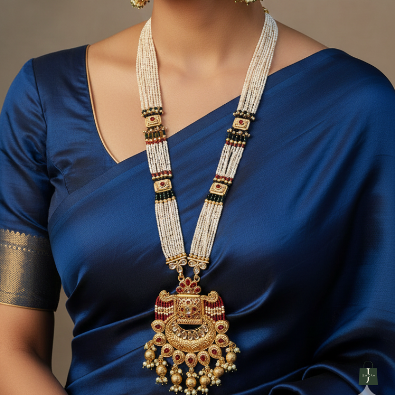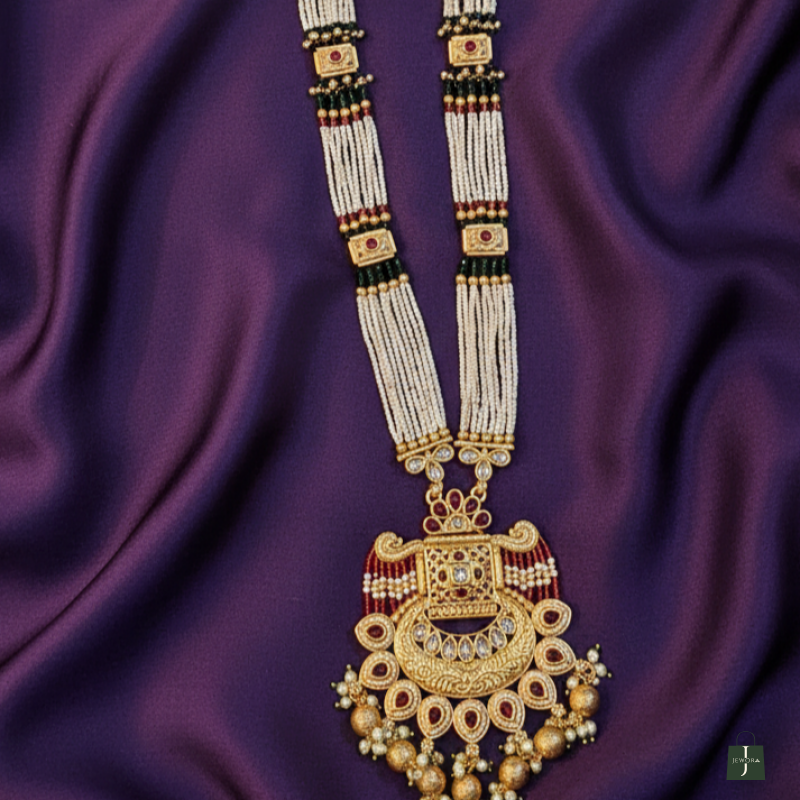 Design: Traditional Rajwadi -inspired long mala with matching jhumka earrings