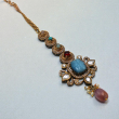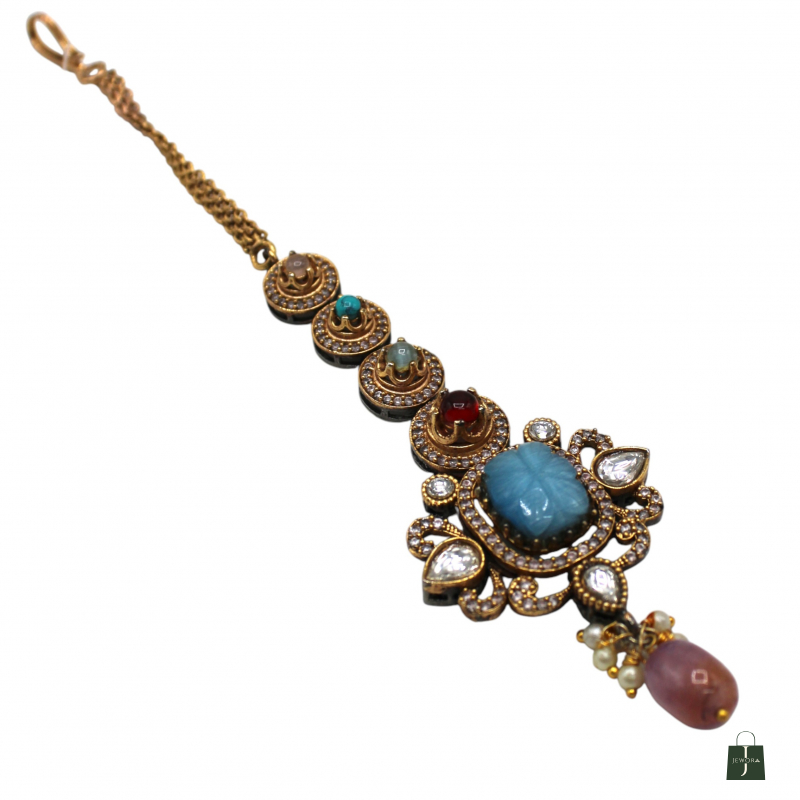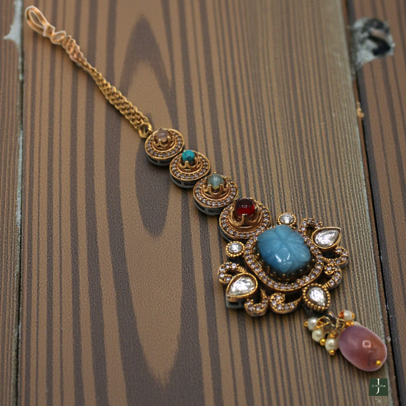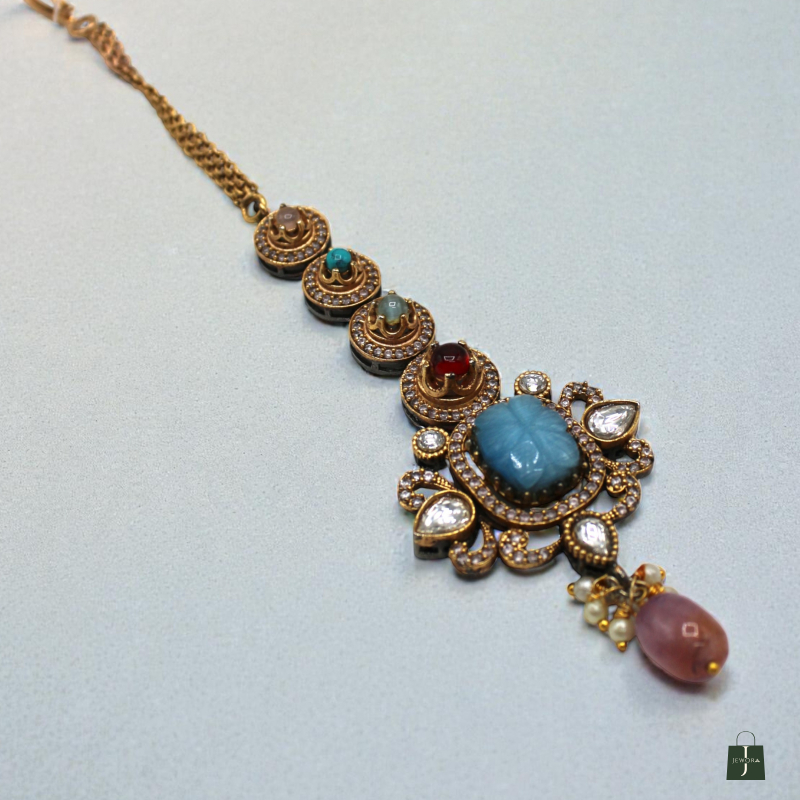 Add a royal touch to your ethnic look with this stunning Rajwadi Neelam Navratna Maang Tikka. Designed in a rich antique gold finish, this tikka features a bold aqua blue center stone surrounded by sparkling white polki stones in an elegant floral pattern.