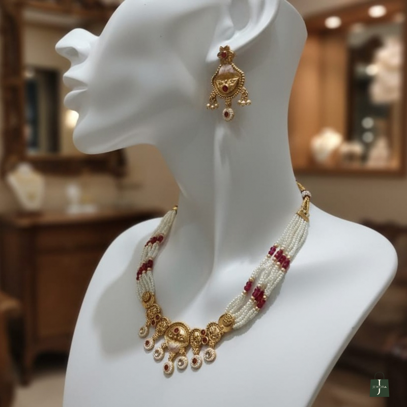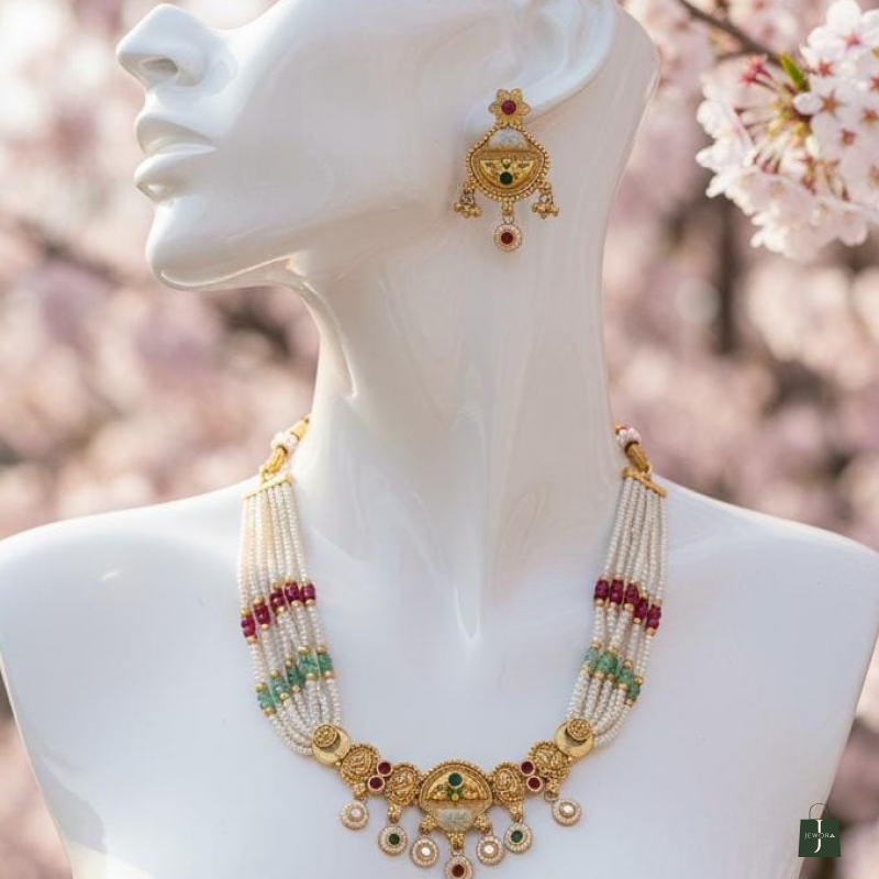 Experience timeless royal elegance with this stunning Rajwadi Panna Moti Haar Set. Designed in classic Rajasthani heritage style, this necklace features multiple layers of fine white pearl (moti) strings beautifully combined with green stone (panna-inspired) beads and antique gold elements.
