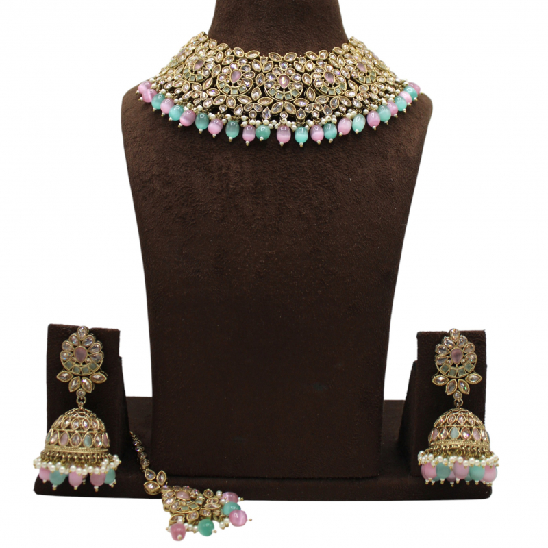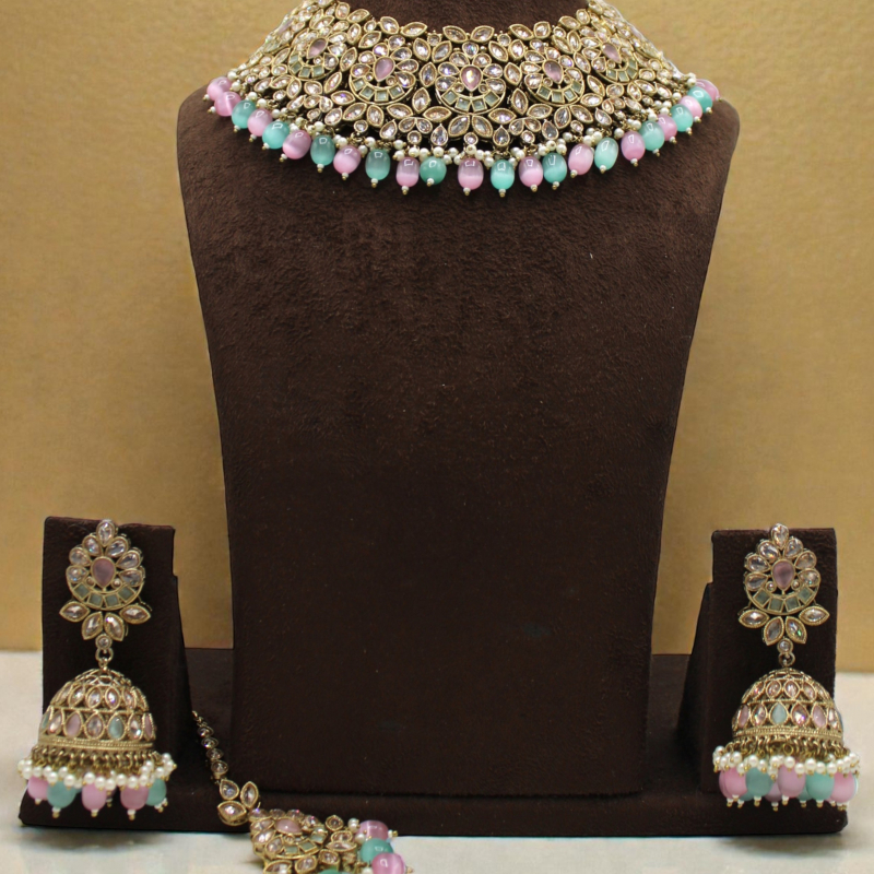 Add soft royal elegance to your festive and bridal look with this beautiful Rajwadi Pastel Meenakari Kundan Choker Set. Crafted with intricate kundan stone detailing in antique gold polish, this choker features delicate floral motifs highlighted with pastel pink and mint green bead drops.