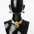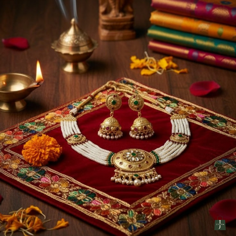 The matching jhumka earrings complement the necklace beautifully, featuring traditional dome design with pearl danglings for a regal finish. Perfect for weddings, festive celebrations, and bridal occasions, this set brings timeless heritage elegance to your look.