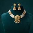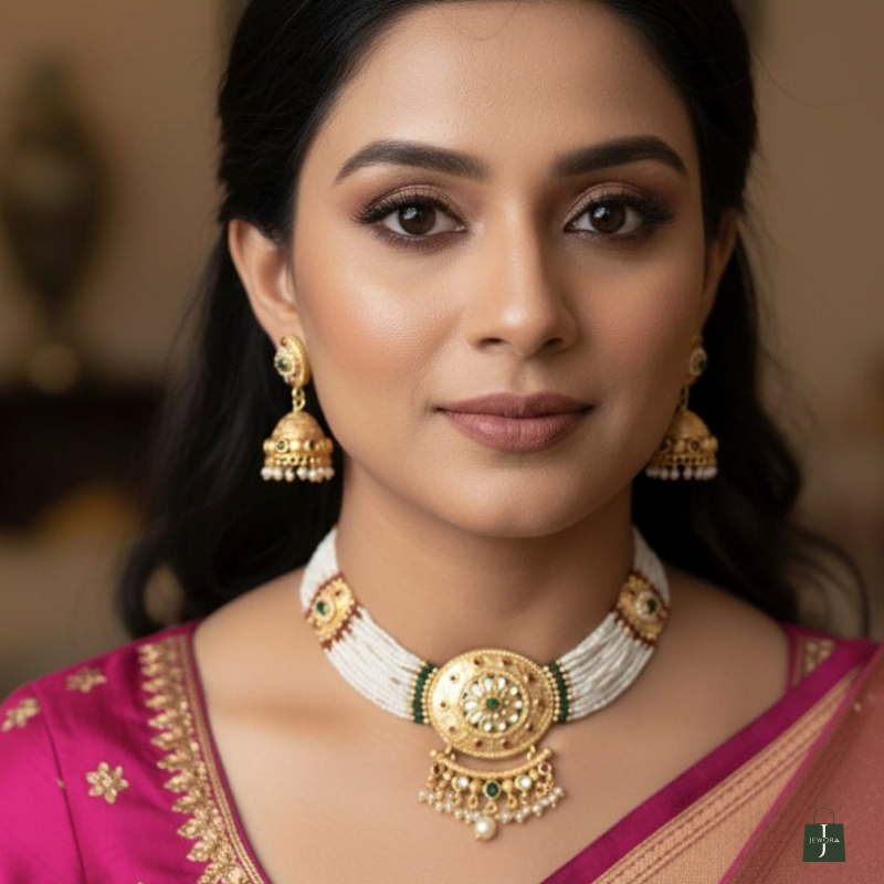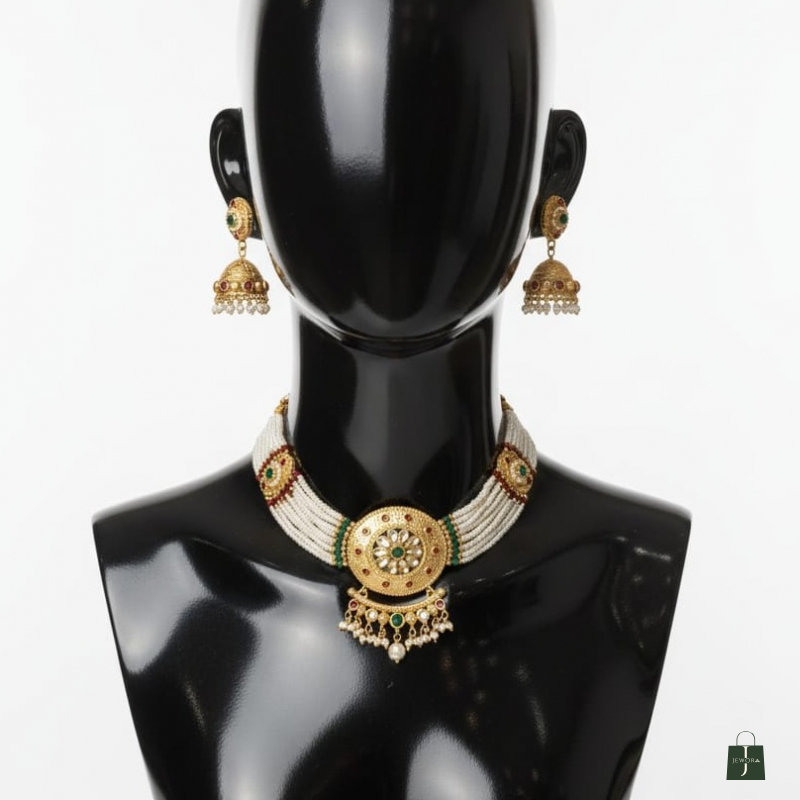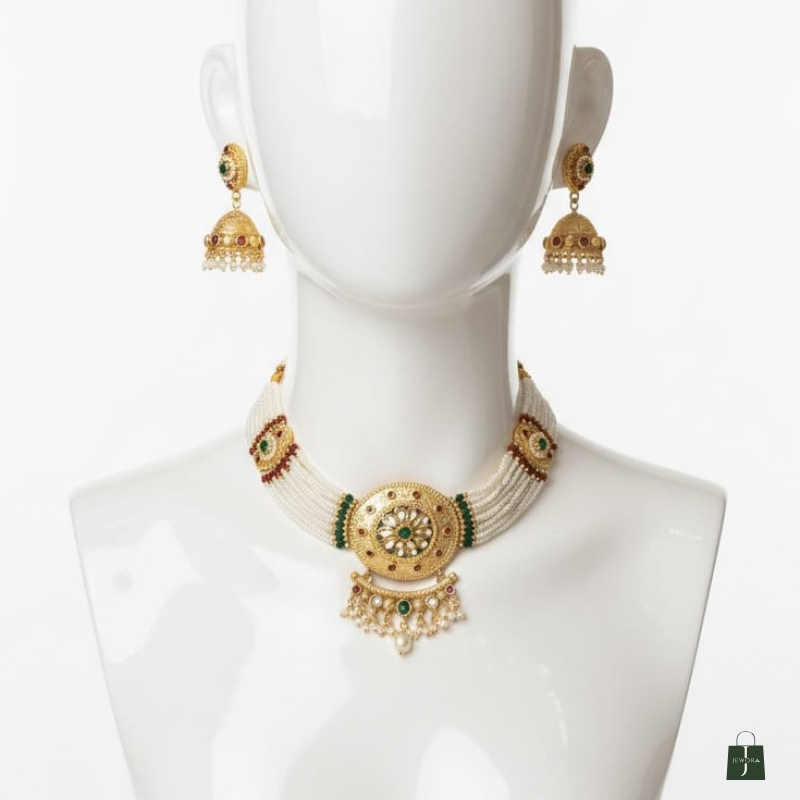 The Rajwadi Pearl Heritage Choker Set is a royal celebration of traditional Indian craftsmanship. Designed with multiple strands of elegant white pearls, this statement choker features a grand circular temple-inspired pendant adorned with intricate gold detailing and rich red and green stone accents.