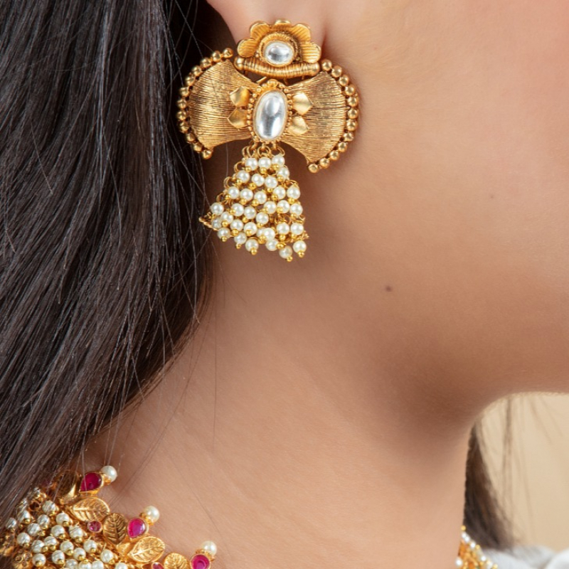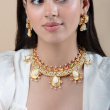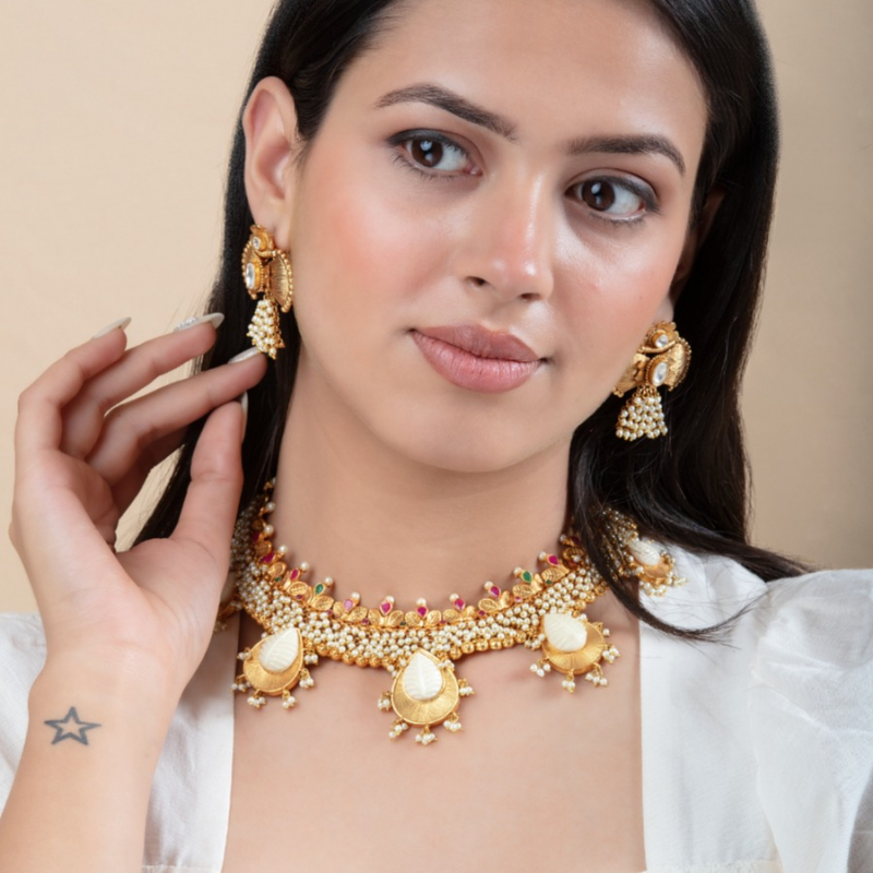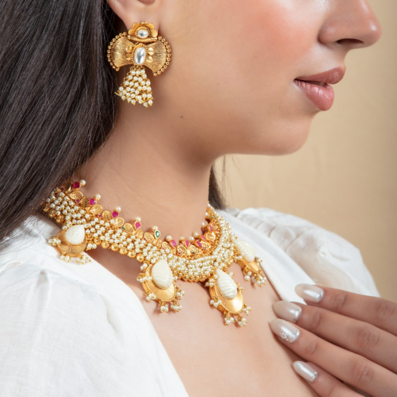 Exude royal charm with this stunning Rajwadi-style choker necklace set, intricately crafted with layers of delicate pearls and adorned with vibrant kundan stones. The design features beautifully carved drop-shaped charms that add a traditional yet luxurious appeal. The harmonious blend of pearls, ruby-green accents, and antique gold polish makes this set perfect for weddings, festive occasions, and grand celebrations. Paired with matching earrings, this set is a timeless addition to your ethnic jewelry collection.