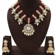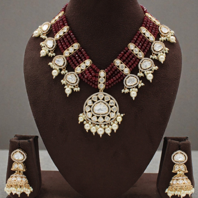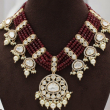 Elevate your ethnic look with this stunning Rajwadi Ranihaar Kundan Necklace Set, designed to reflect timeless royal elegance. This handcrafted masterpiece features multiple layers of deep maroon beads beautifully combined with traditional polki-style kundan stones. The grand circular pendant with pearl drops enhances its majestic appeal, making it perfect for weddings, festive occasions, and bridal wear.