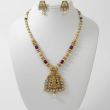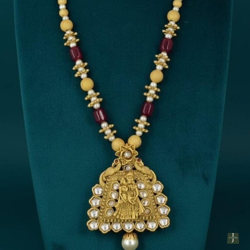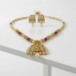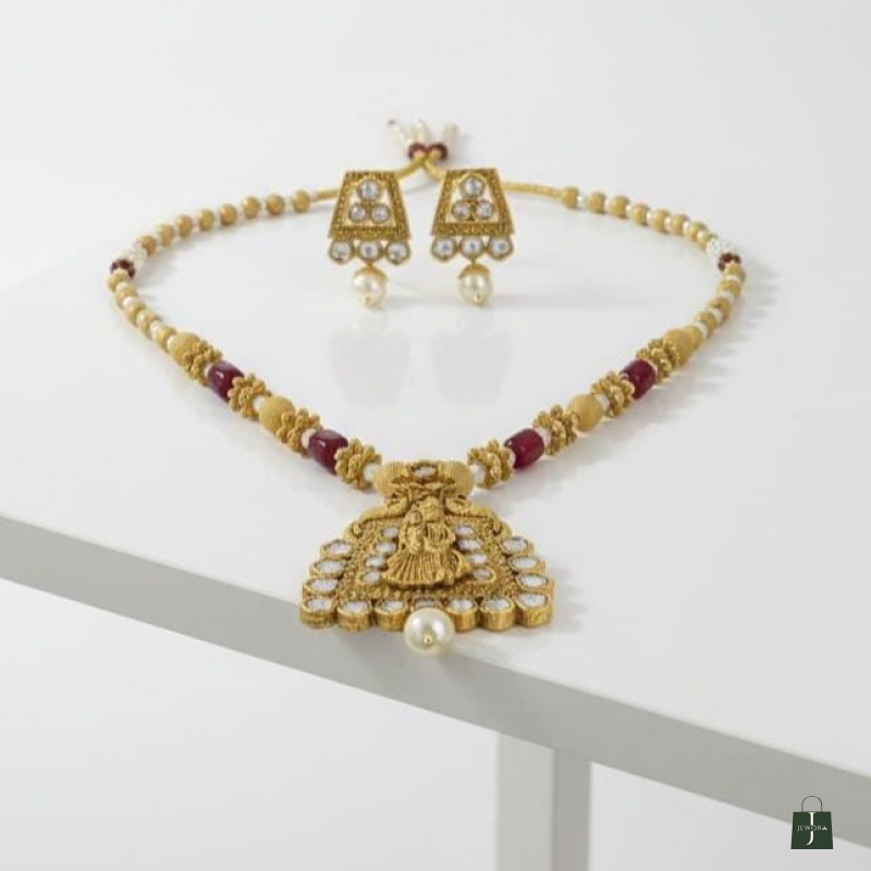 Step into timeless royalty with this Rajwadi Royal Heritage Temple Pendant Necklace Set. Inspired by traditional Rajwadi craftsmanship, this stunning set showcases an intricately carved temple-style pendant in antique gold finish, beautifully embellished with sparkling white stones.