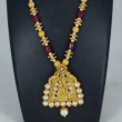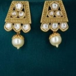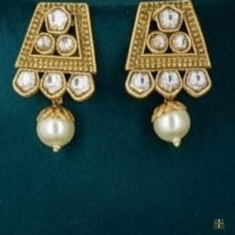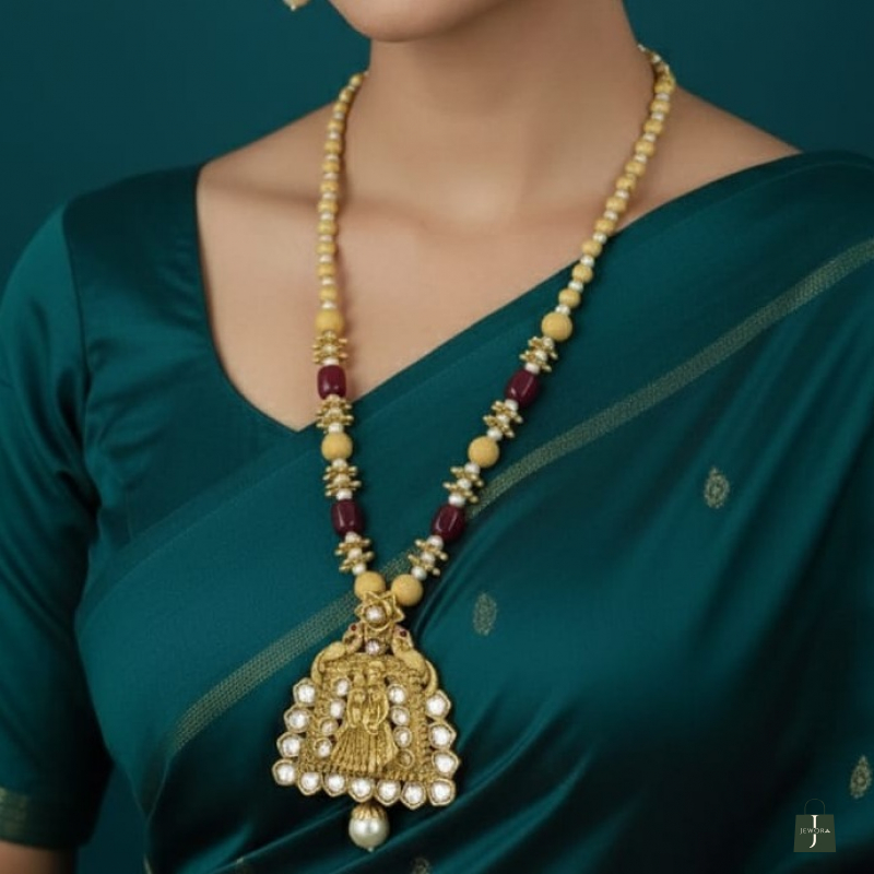 The necklace is adorned with rich gold-toned beads and elegant green accent beads, giving it a regal and heritage look. Paired with matching geometric Rajwadi stud earrings featuring delicate pearl drops, this set is perfect for brides and festive occasions.